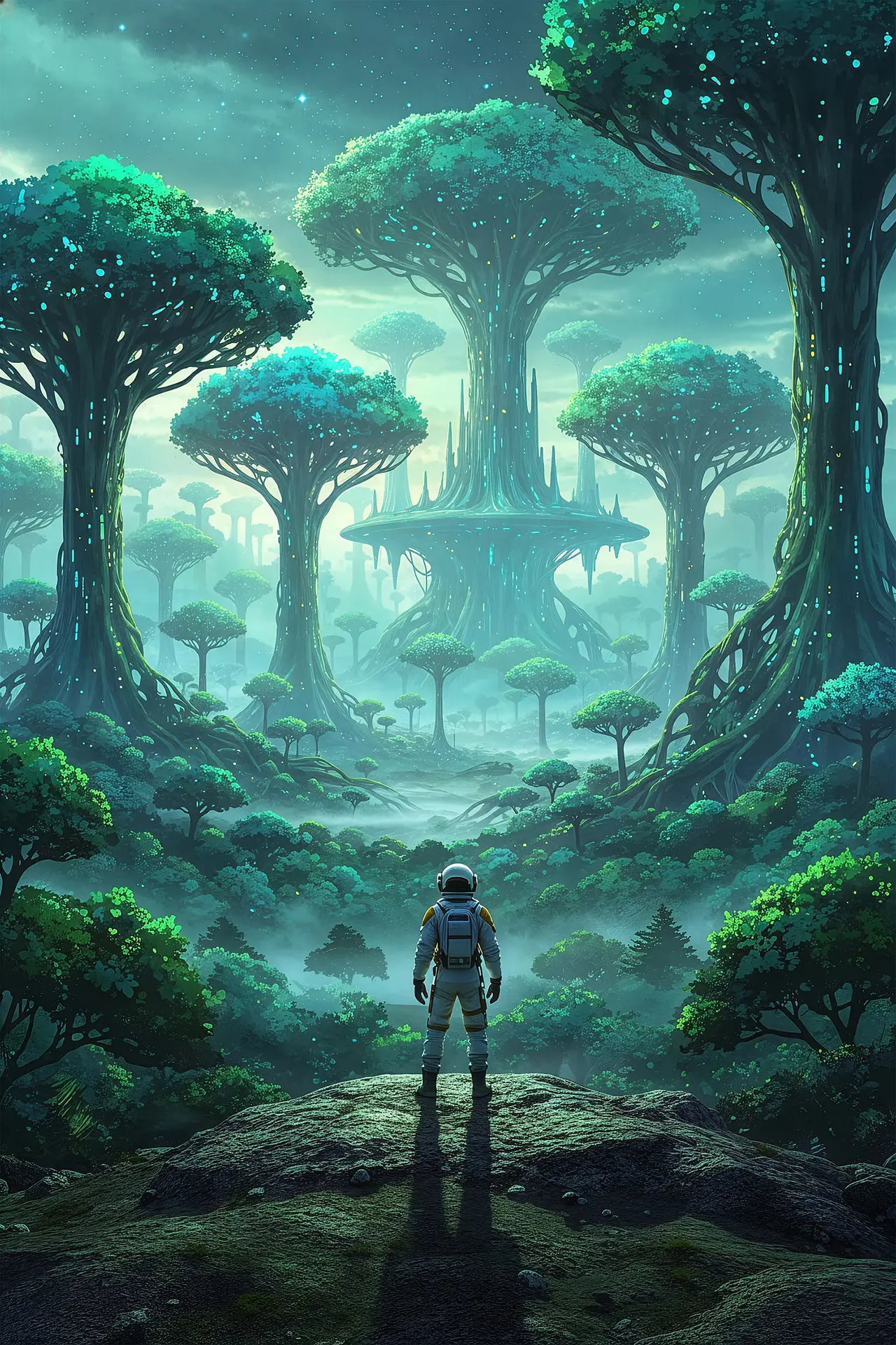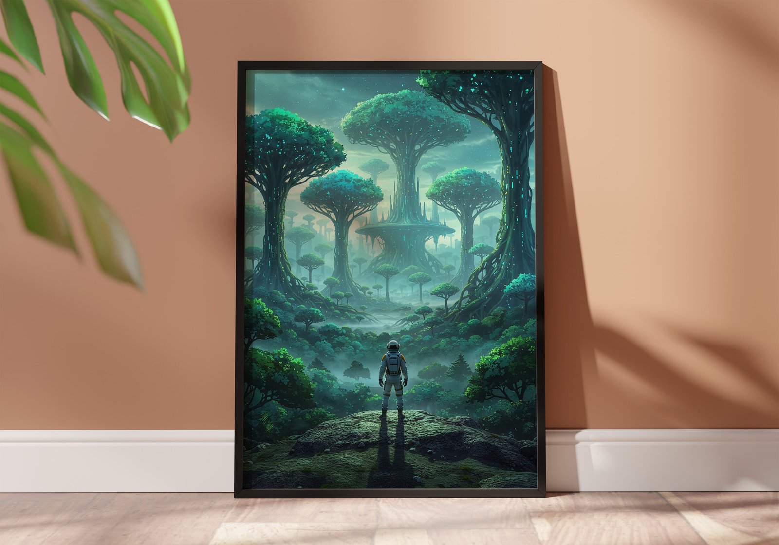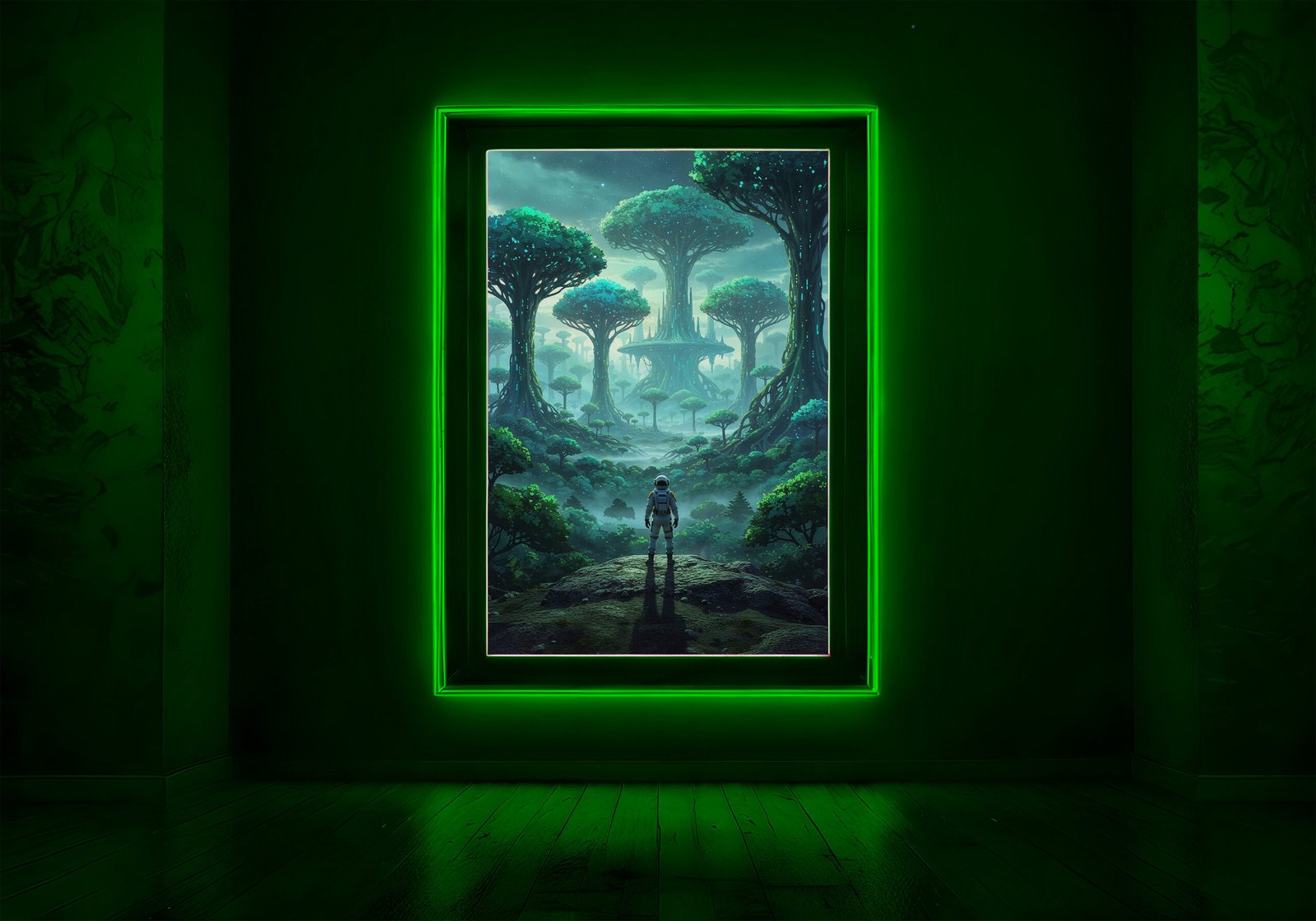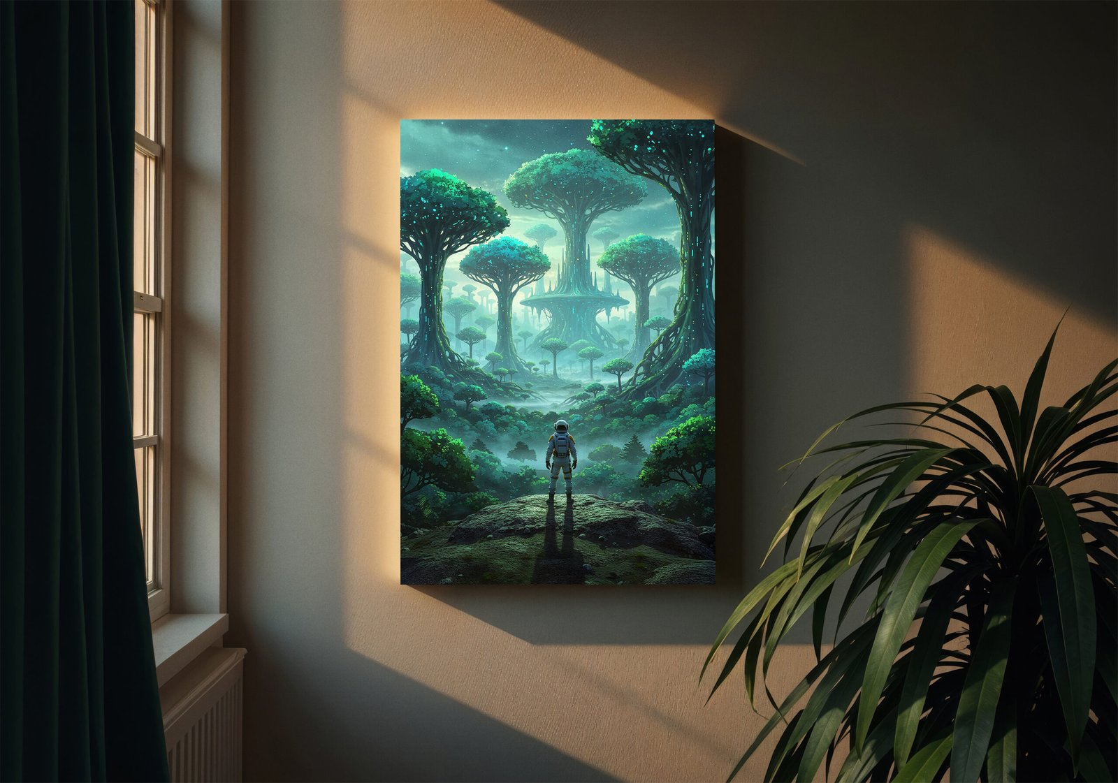 Een magisch bos dat rechtstreeks uit een andere wereld lijkt te komen. Deze poster toont gigantische bomen met gloeiende accenten en een zachte mist die het geheel een dromerige sfeer geeft.