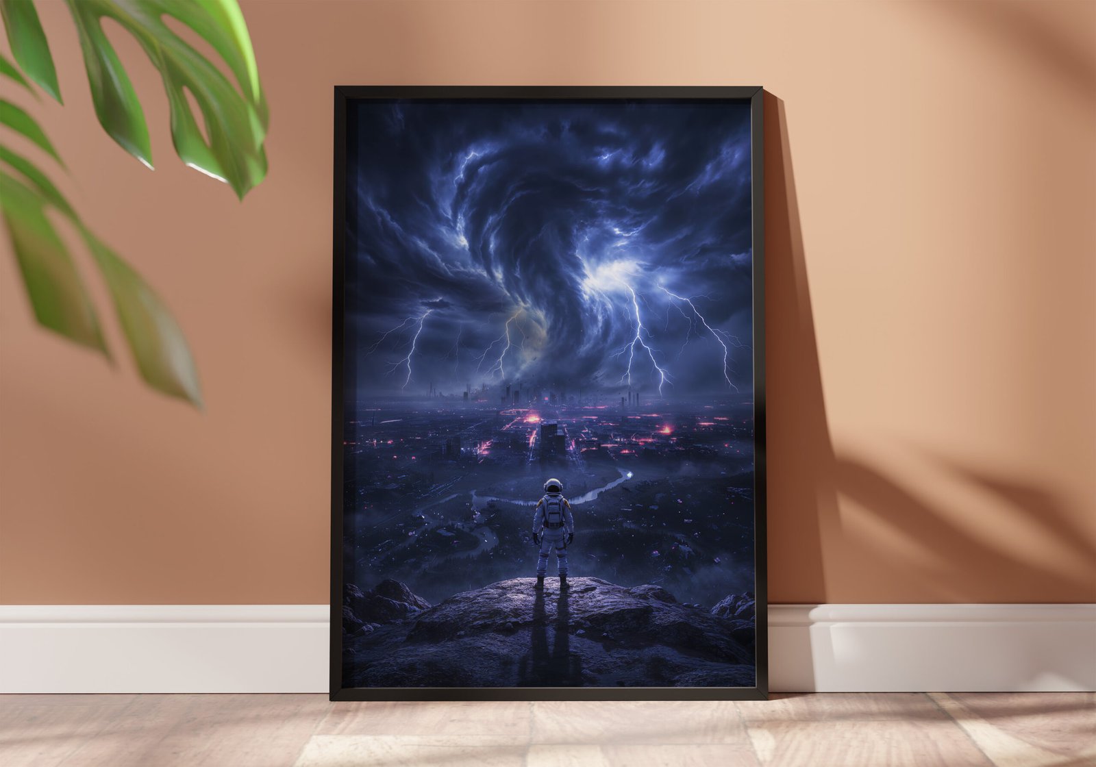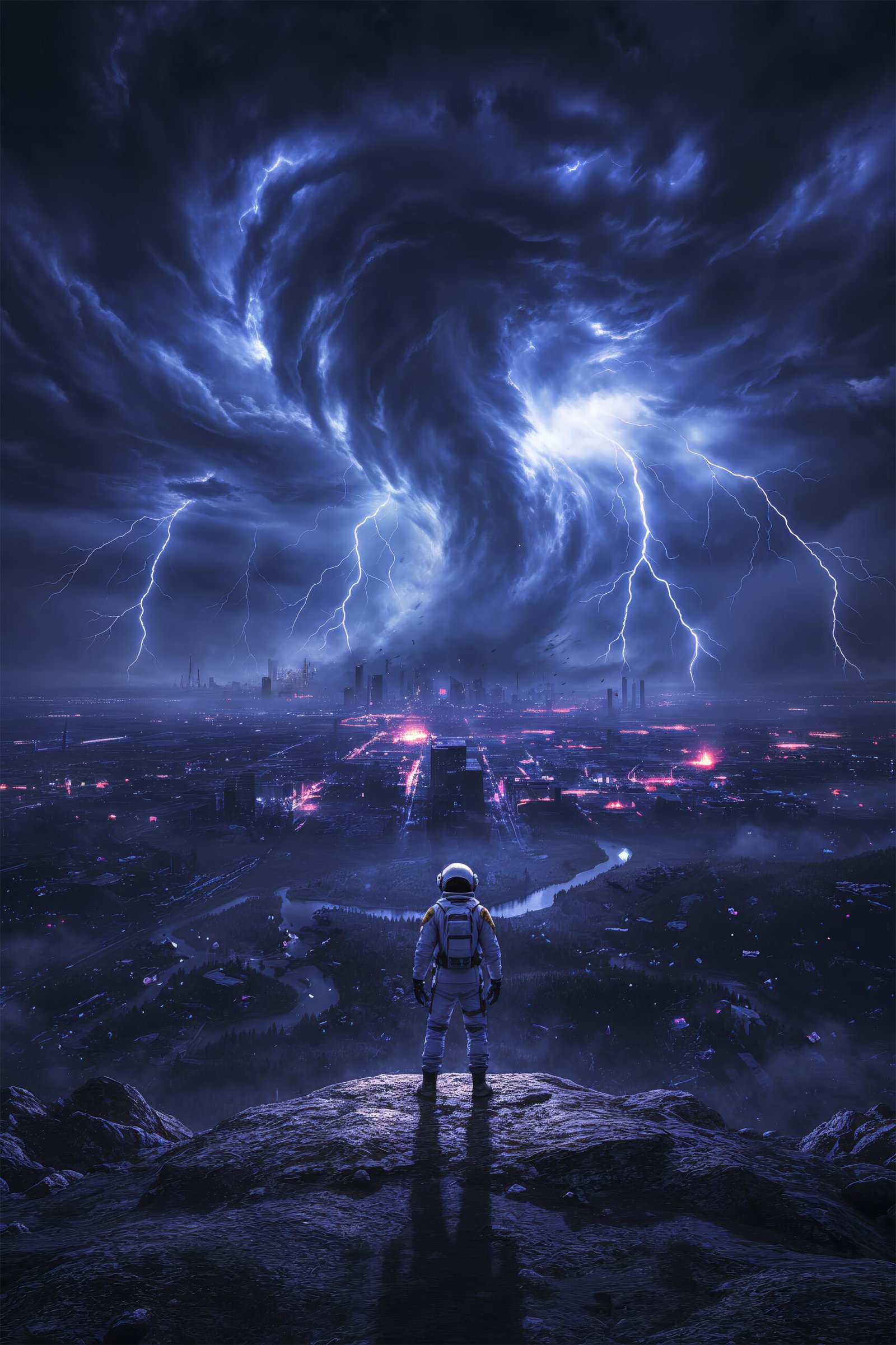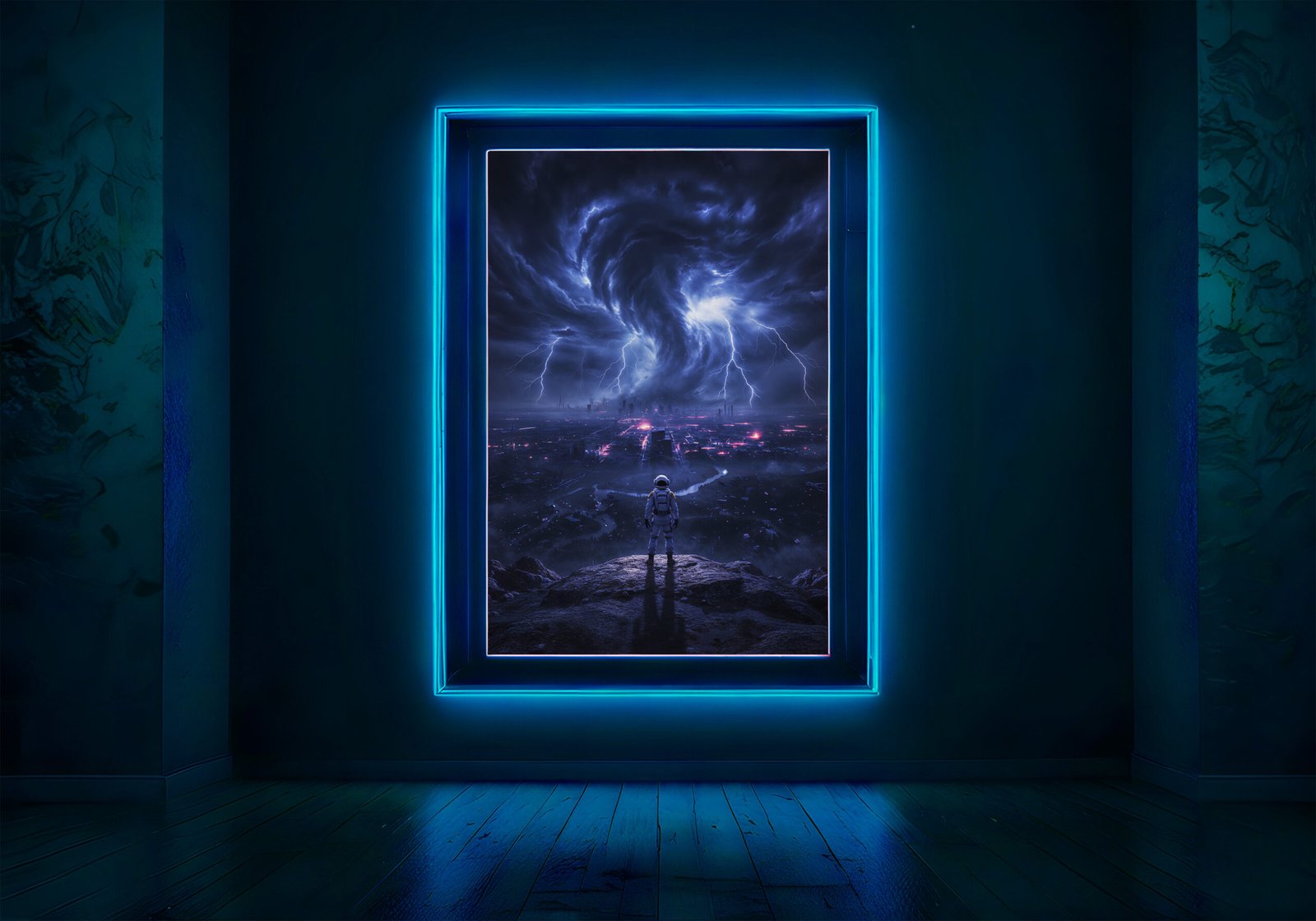 De donkere blauwtinten in combinatie met fel wit licht van de bliksem zorgen voor een dramatisch contrast en een intense, energieke uitstraling. De astronaut op de voorgrond lijkt getuige van een wereld op de rand van vernietiging.