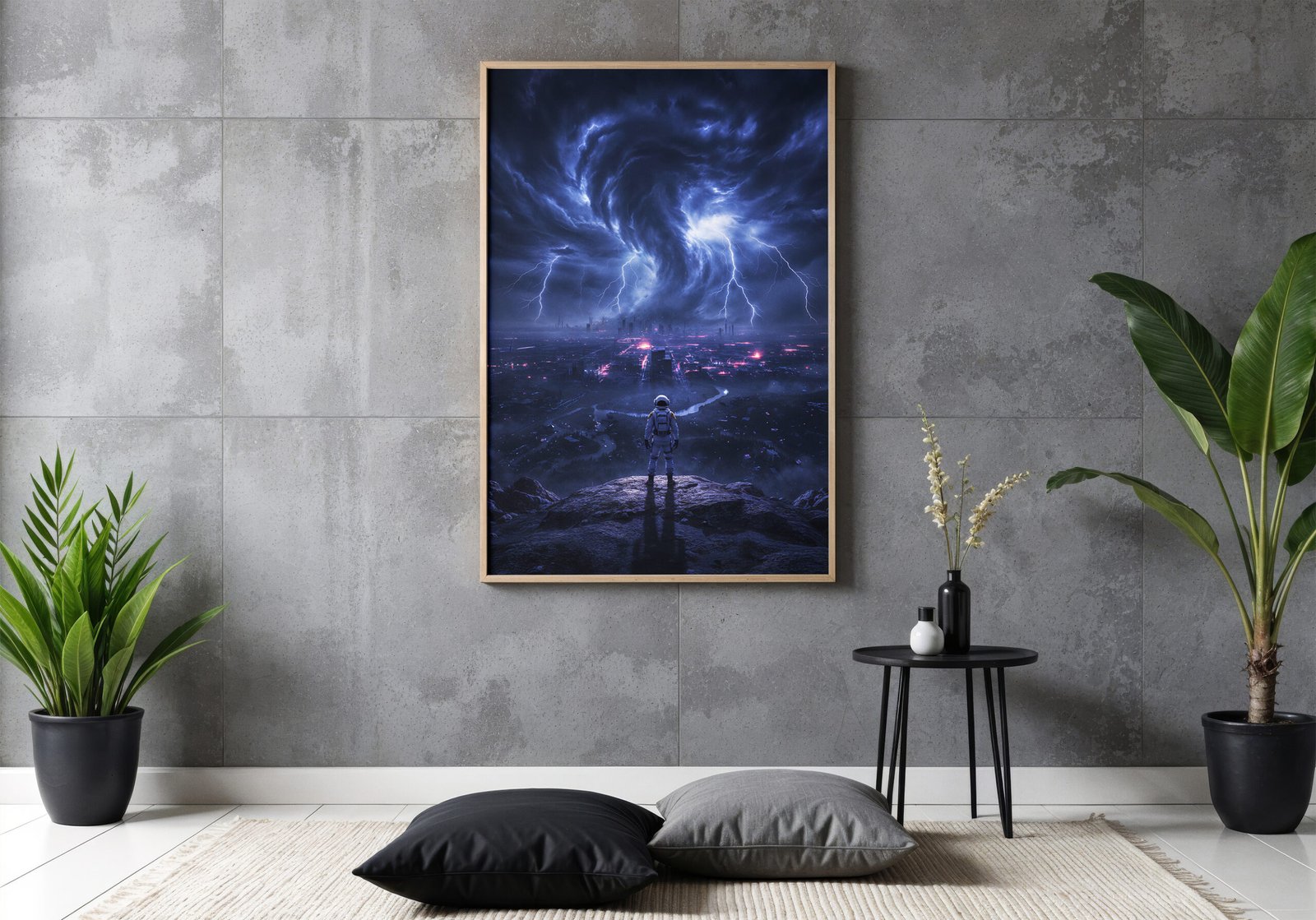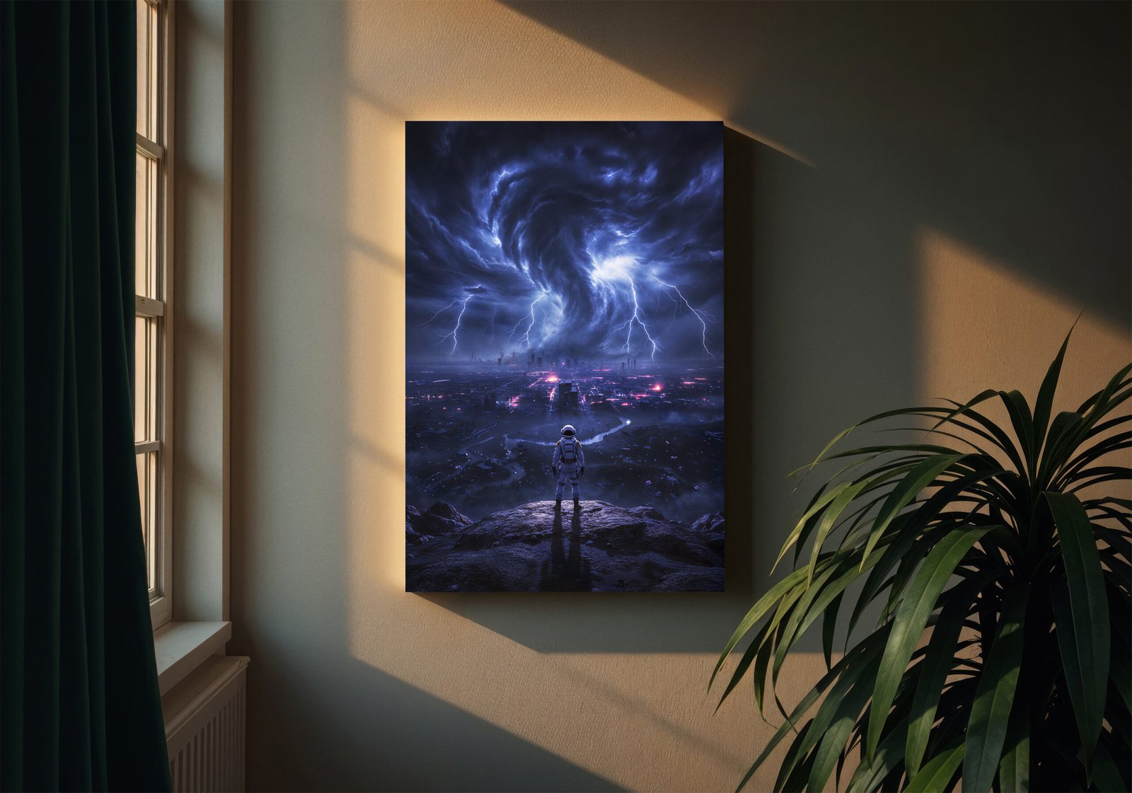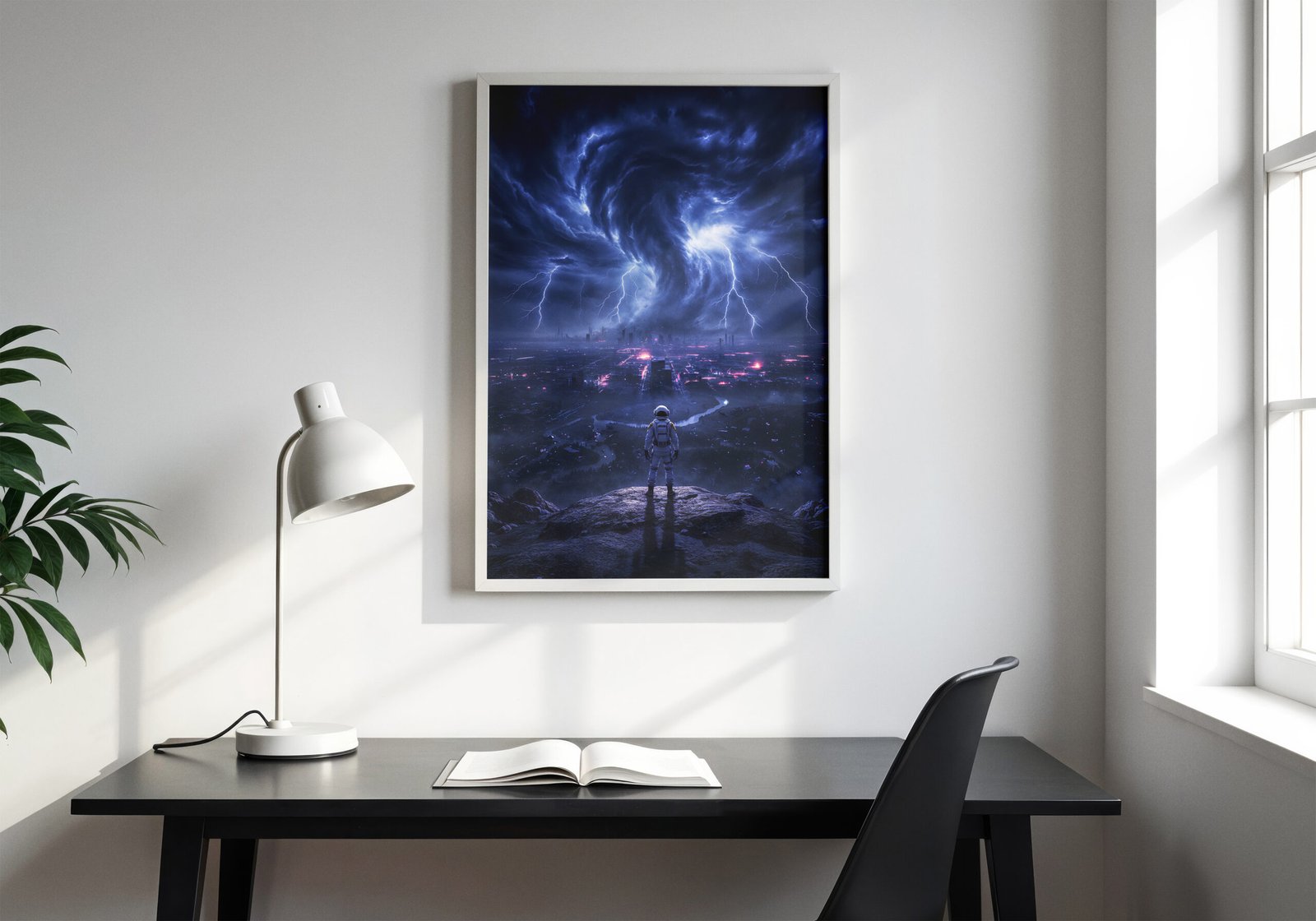 De donkere blauwtinten in combinatie met fel wit licht van de bliksem zorgen voor een dramatisch contrast en een intense, energieke uitstraling. De astronaut op de voorgrond lijkt getuige van een wereld op de rand van vernietiging.