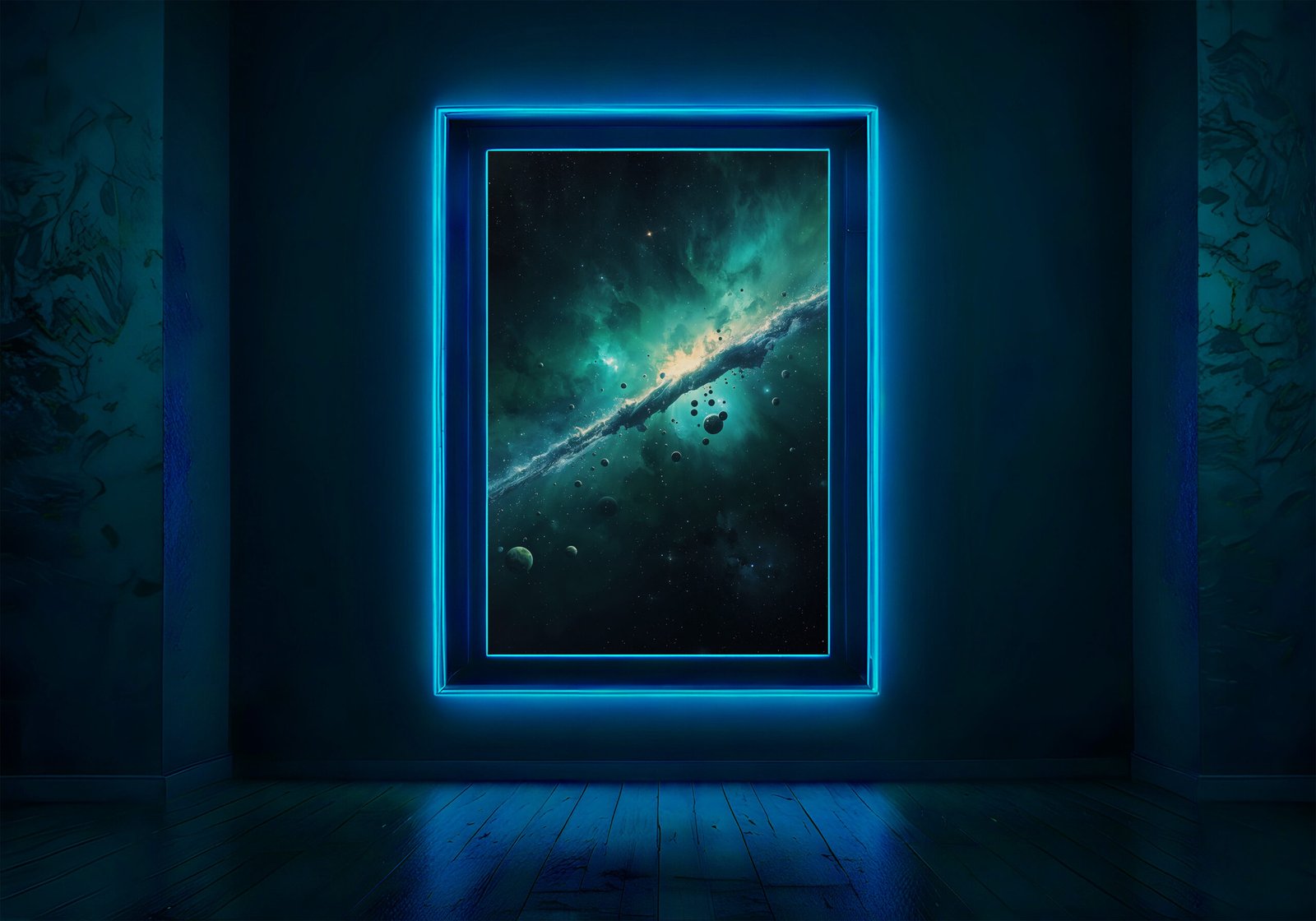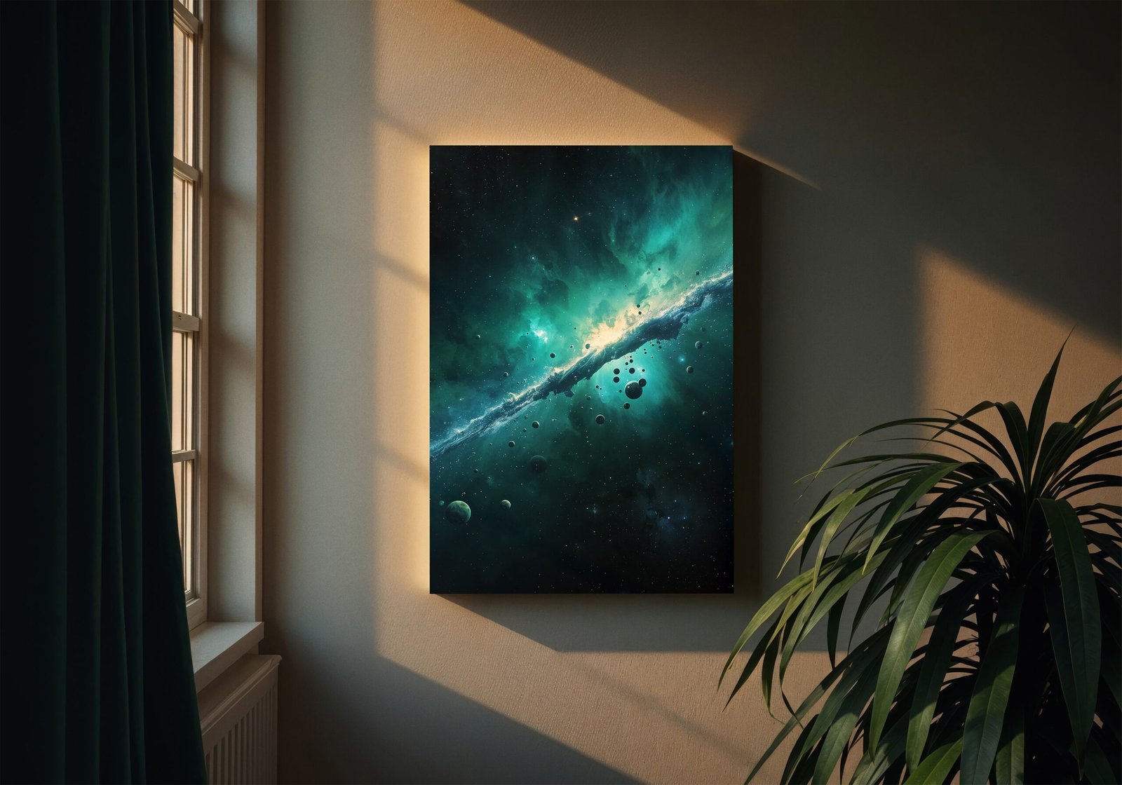 De diepe groene en blauwe tinten creëren een rustgevende maar krachtige sfeer, terwijl het felle licht in het midden zorgt voor een sterk contrast en visuele focus. Subtiele details zoals zwevende deeltjes en verre hemellichamen geven het beeld extra diepte en een bijna dromerige uitstraling.