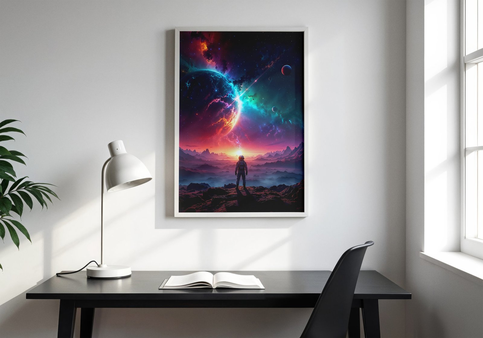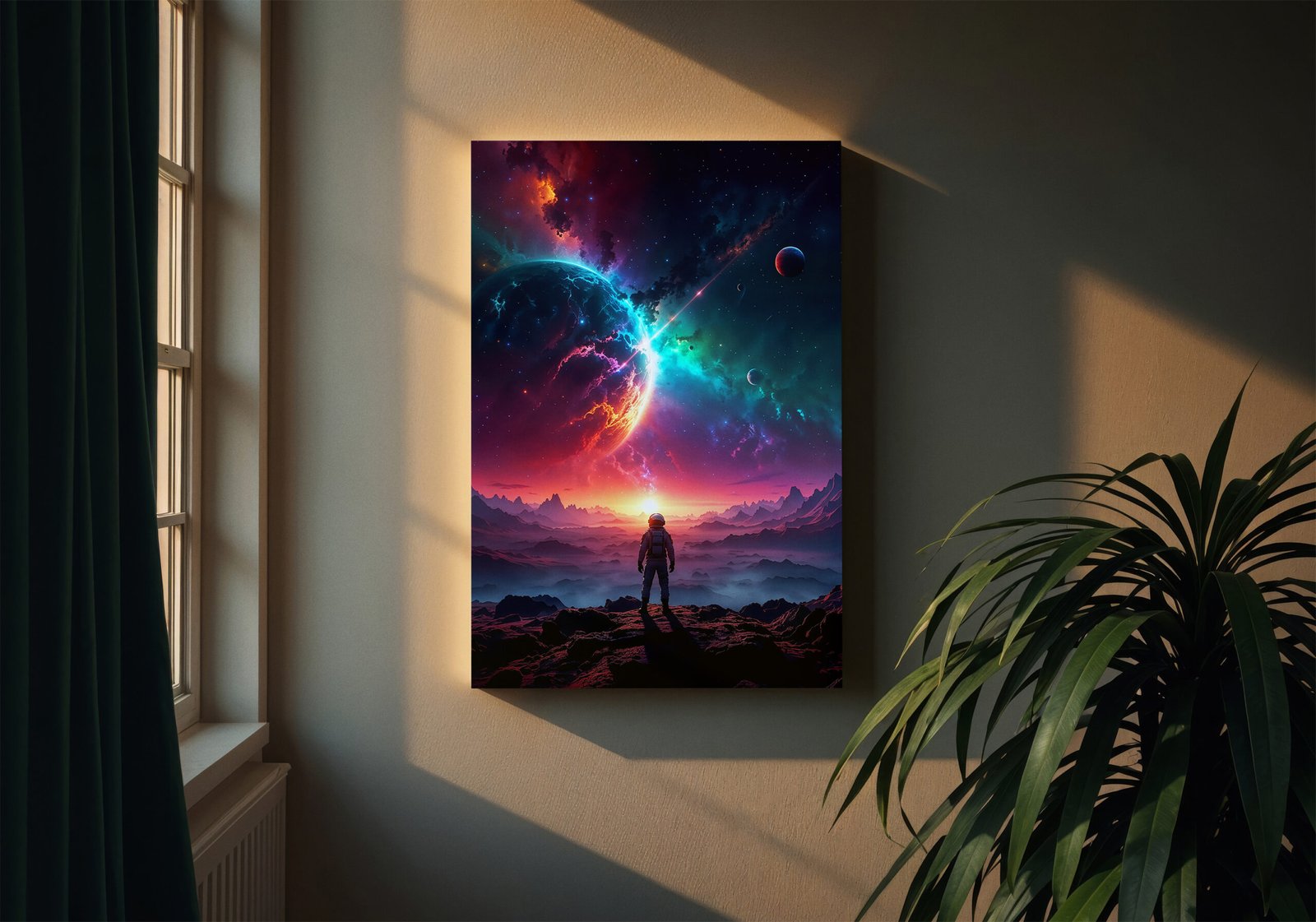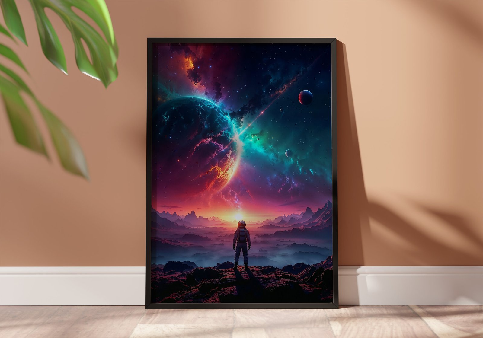 Een adembenemend uitzicht op een nabije planeet, omringd door kleurrijke nevels en sterren. Deze poster combineert diepe ruimte met warme horizonkleuren, waardoor een unieke balans ontstaat tussen rust en energie.