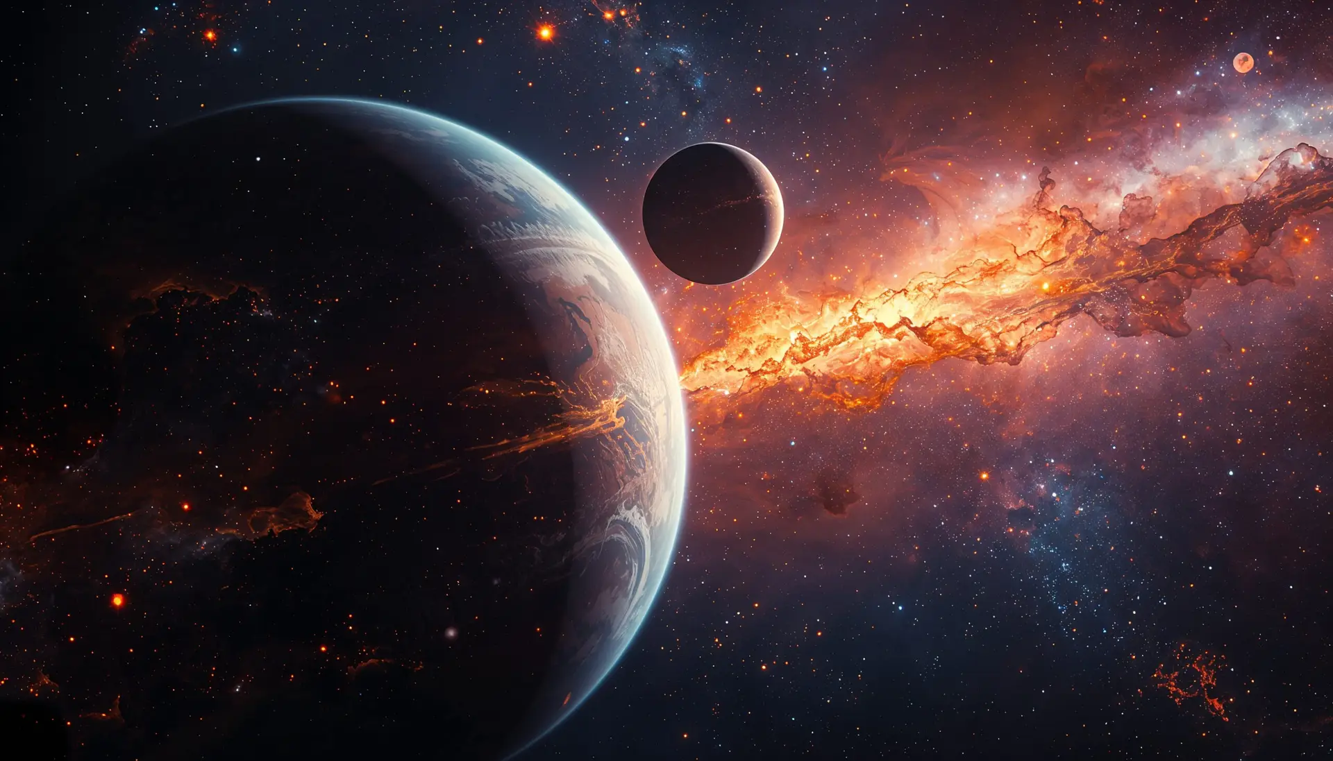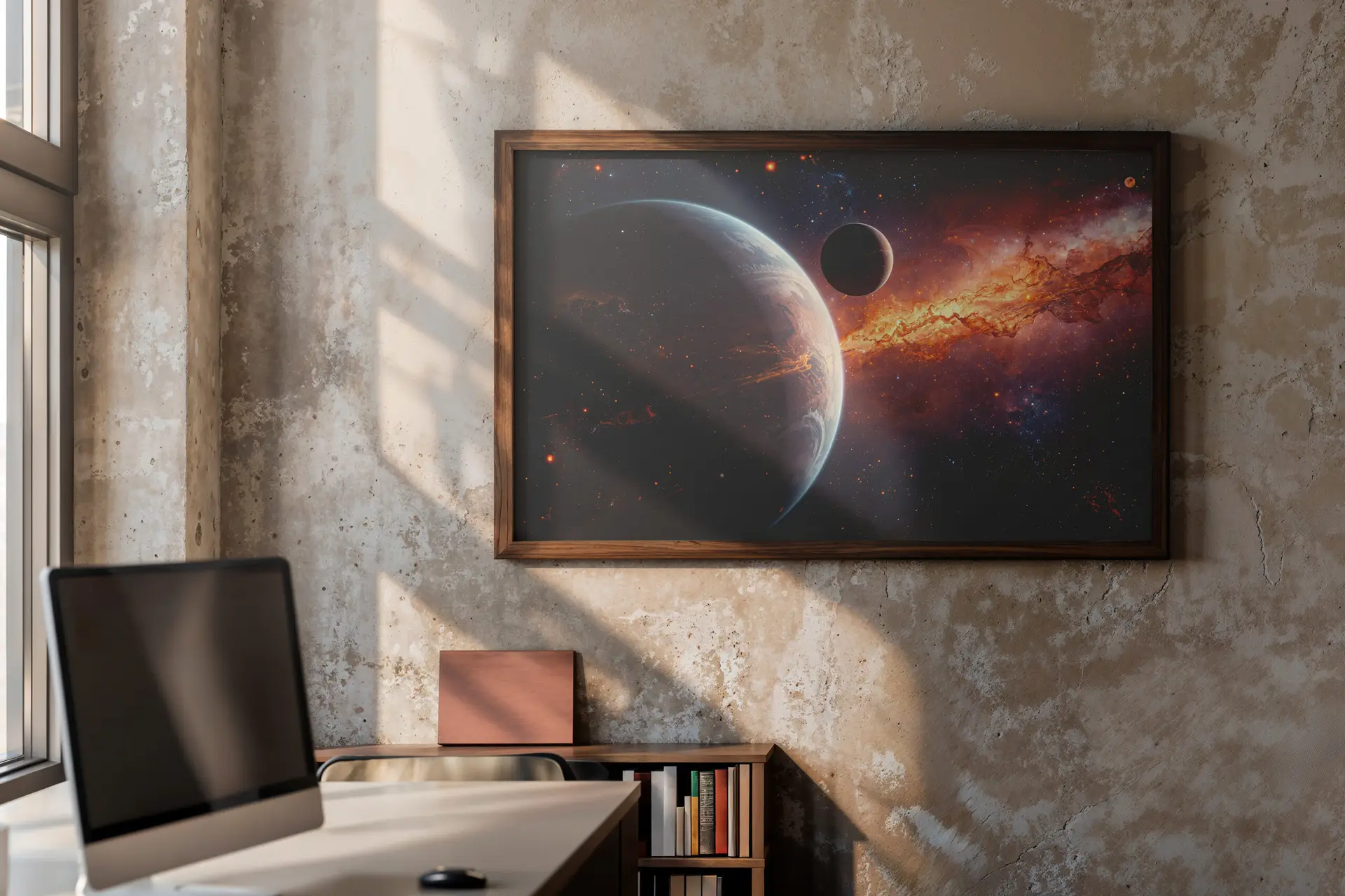 Breng de magie van het universum naar je ruimte met deze indrukwekkende space poster. Een gigantische planeet wordt doorkruist door een vurige kosmische scheur, terwijl een tweede planeet stil op de achtergrond zweeft. De combinatie van diepe schaduwen, heldere sterren en explosieve energiestromen zorgt voor een krachtig en dynamisch beeld dat direct de aandacht trekt.