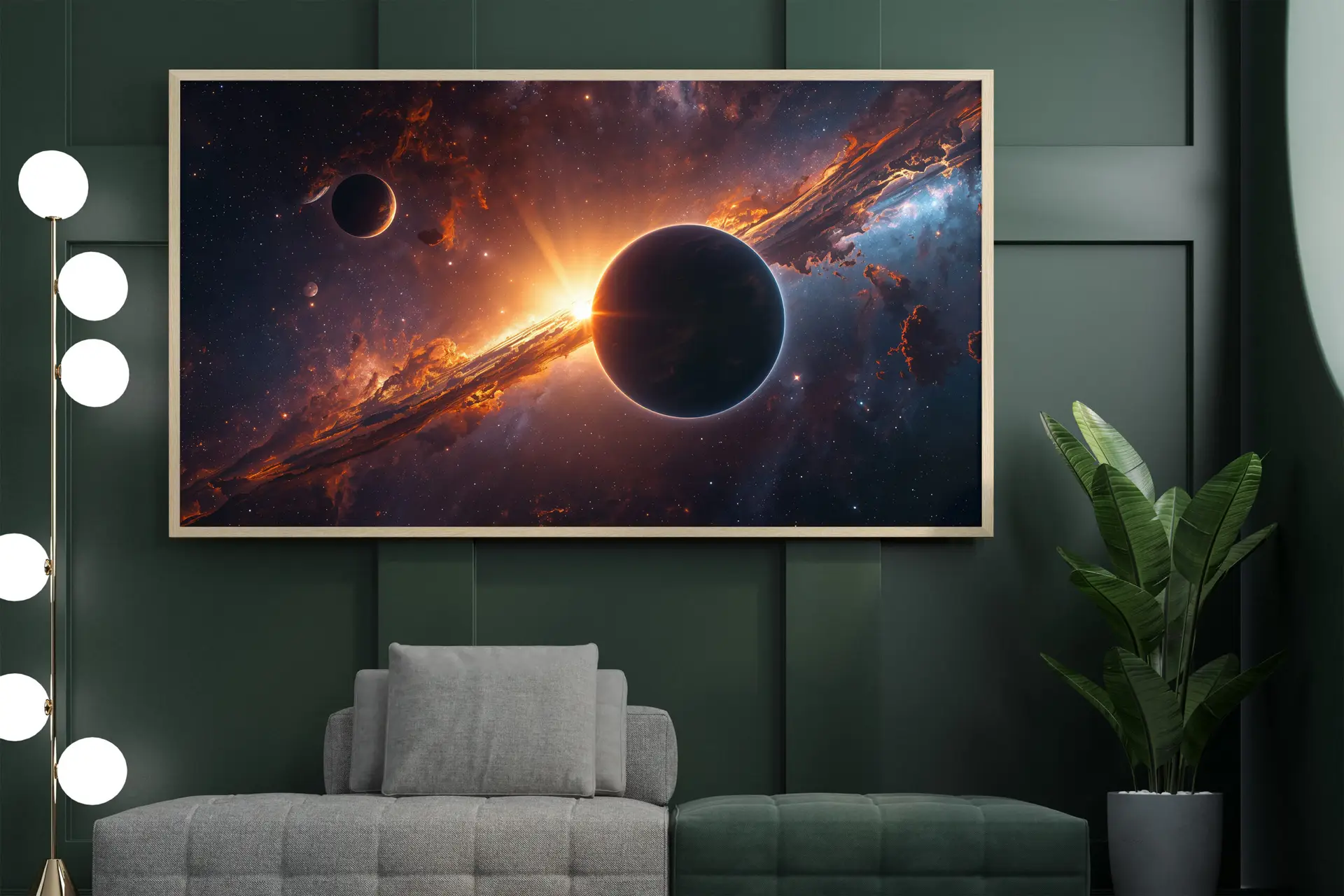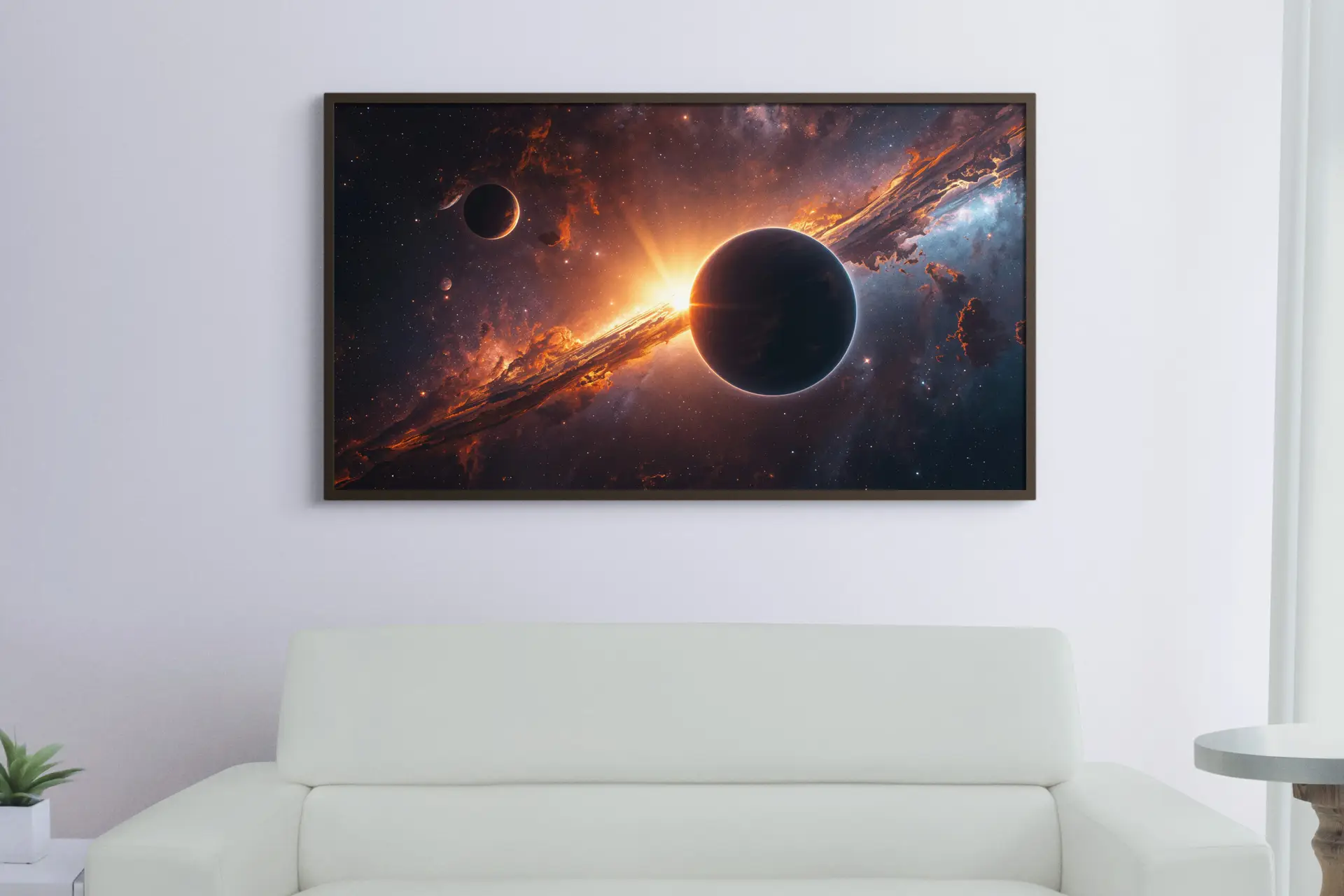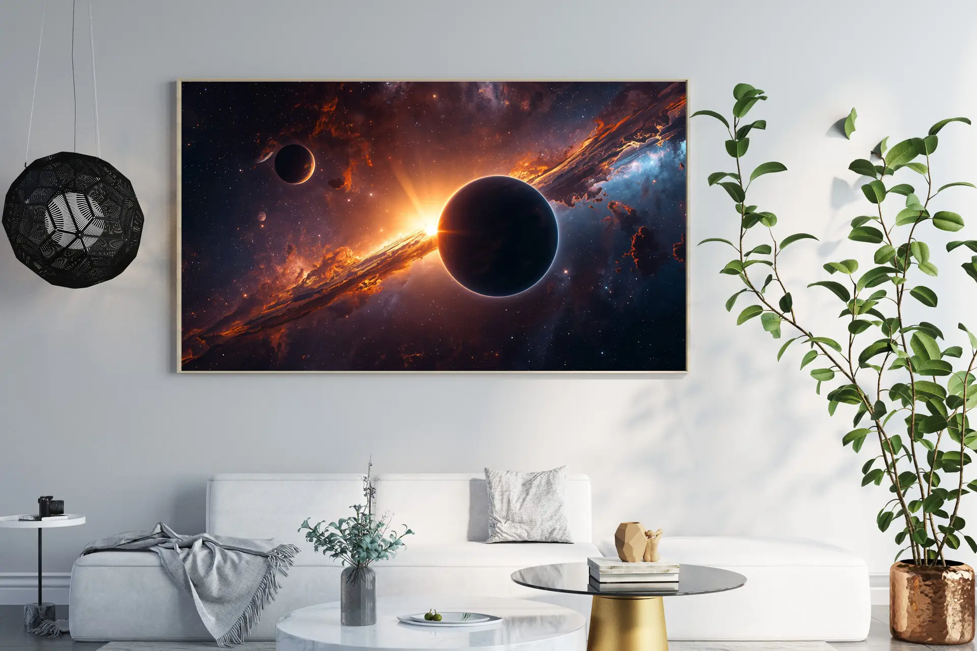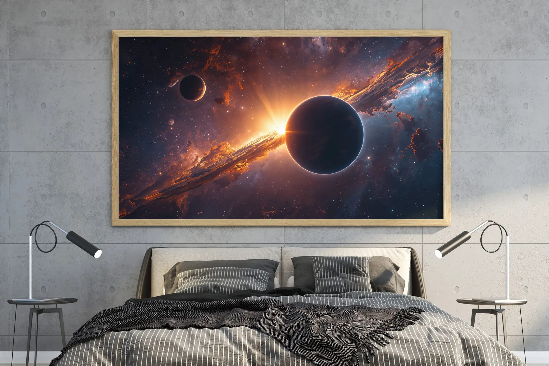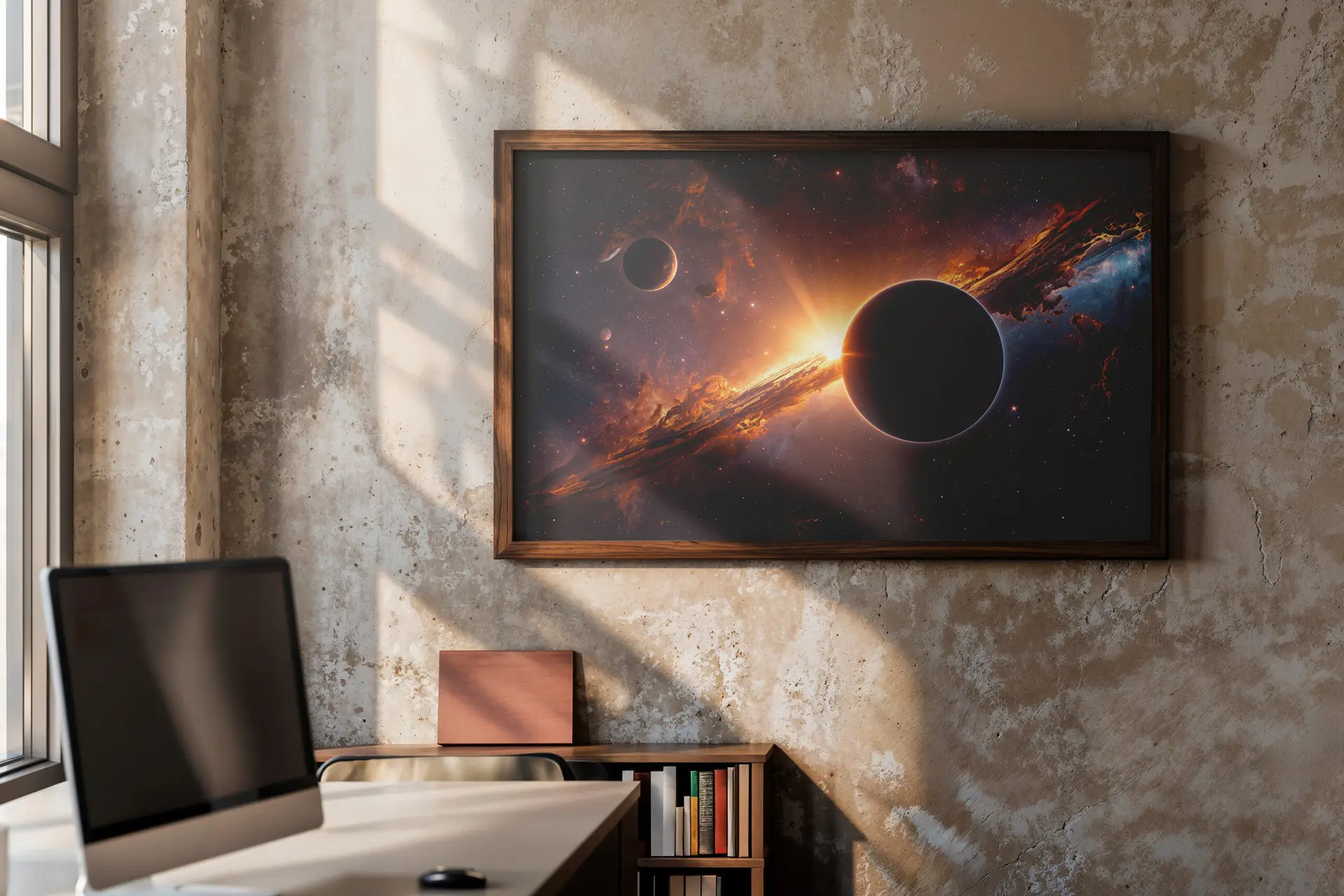 Breng de kracht en schoonheid van het universum naar je interieur met deze indrukwekkende space poster. Een gigantische planeet staat centraal terwijl een vurige kosmische explosie het sterrenstelsel doorkruist. De combinatie van diepe donkere tinten en warme, explosieve kleuren zorgt voor een dramatisch contrast dat direct de aandacht trekt.