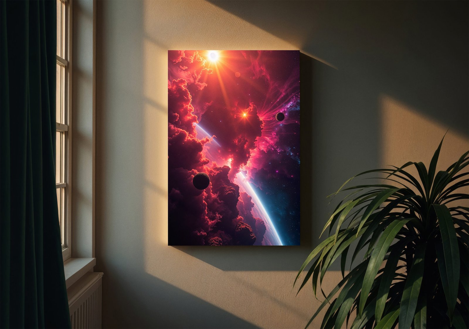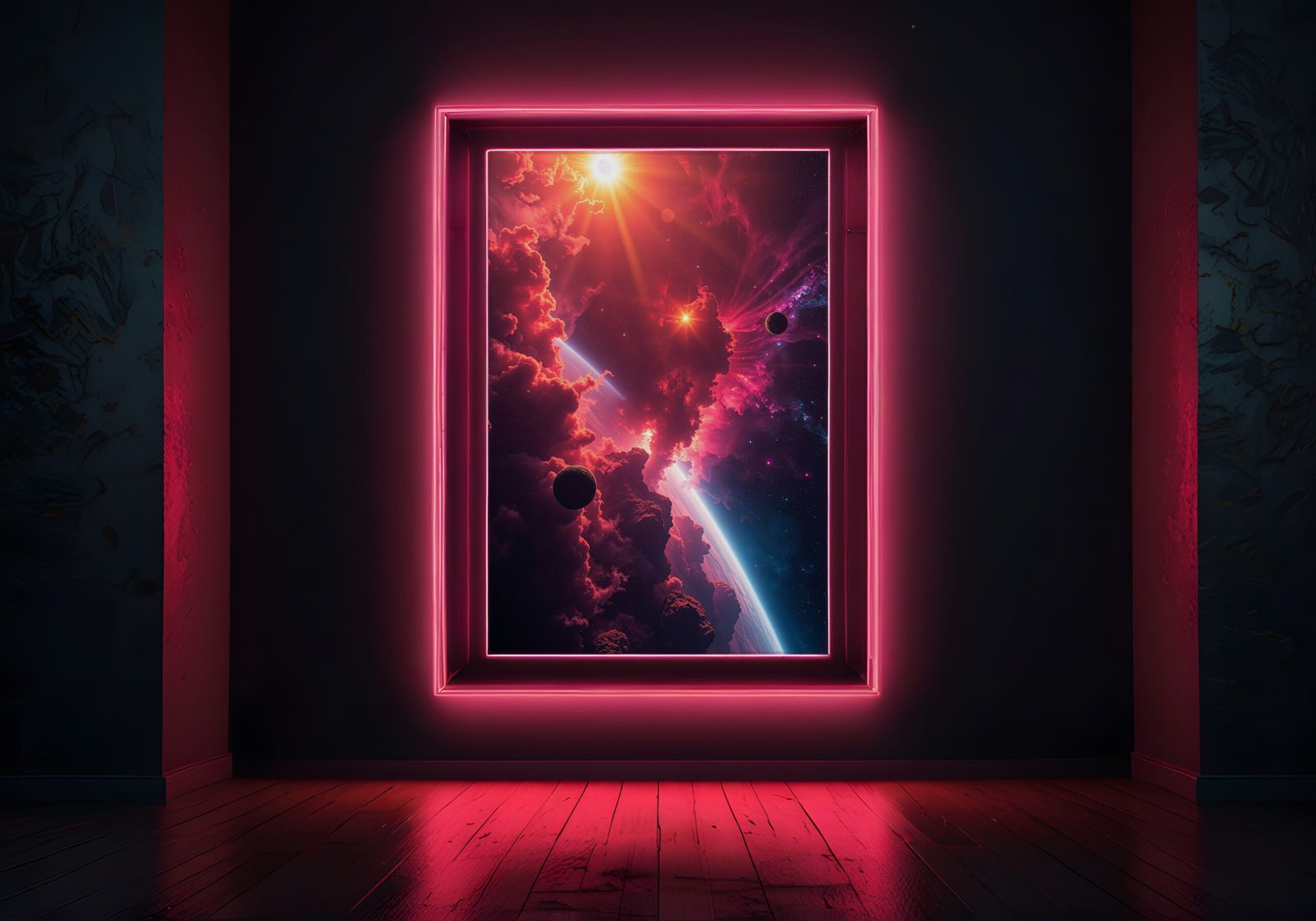 De combinatie van felle rode, roze en paarse tinten geeft het beeld een krachtige en artistieke uitstraling. De diepte en beweging zorgen voor een levendig en bijna surrealistisch geheel.