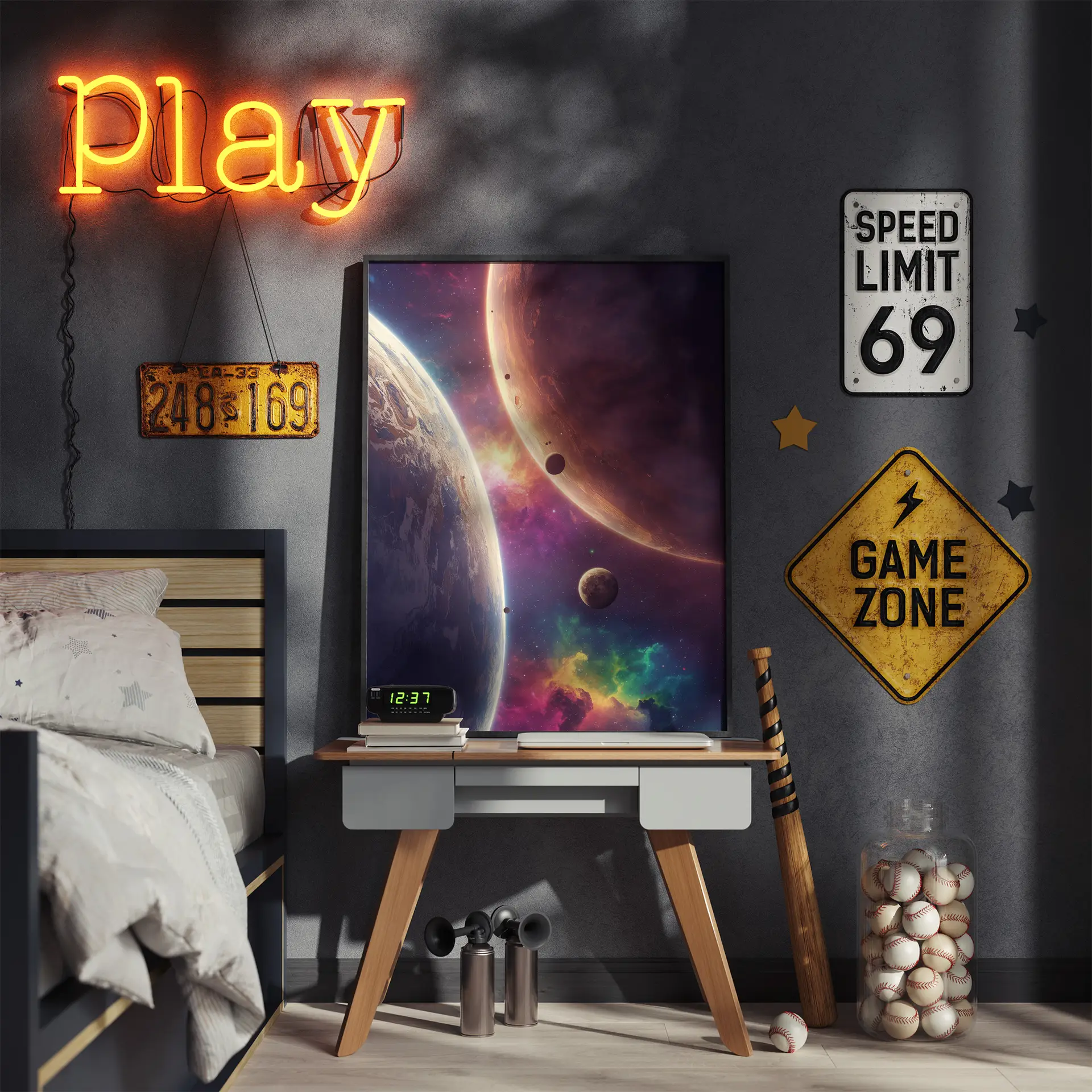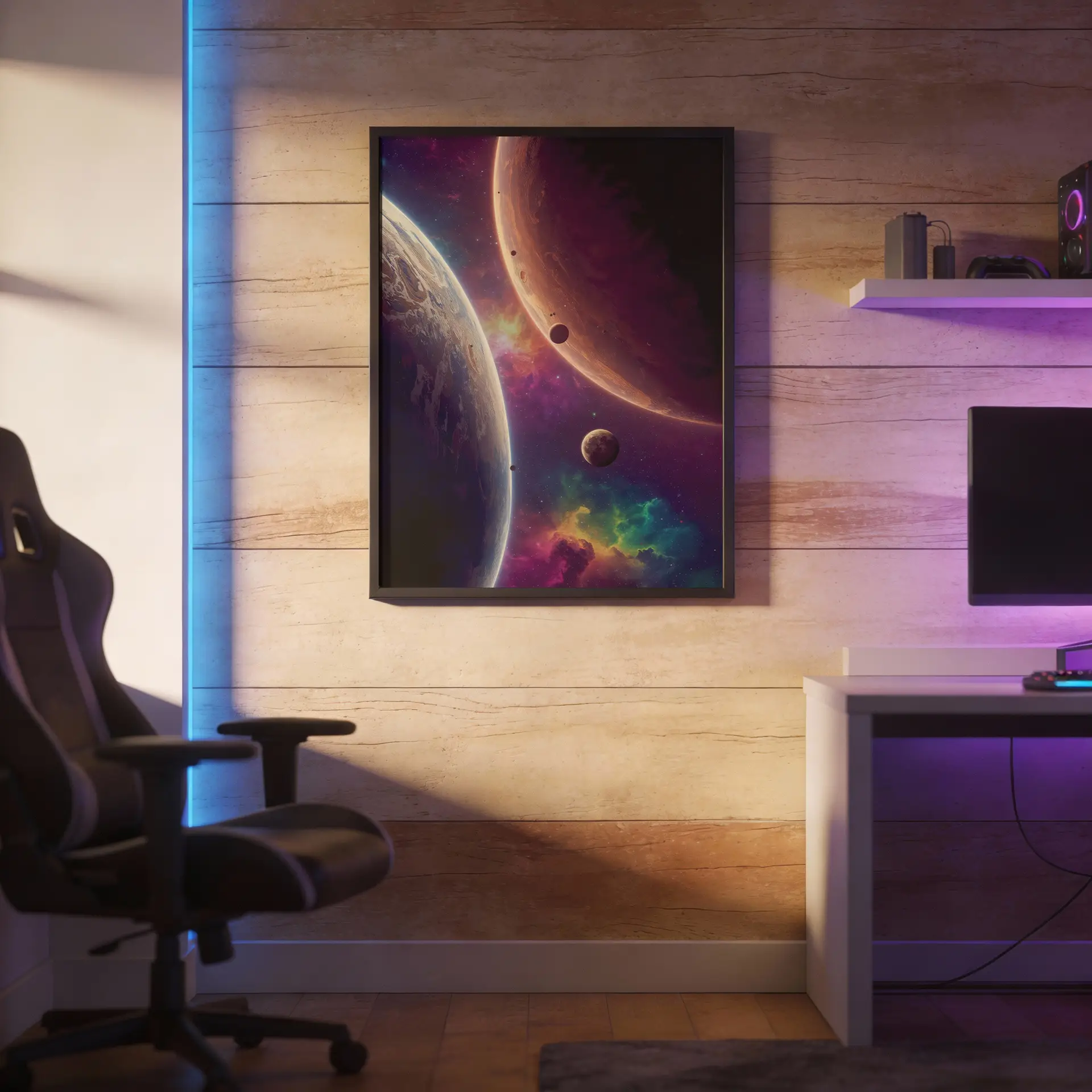 Stap in een indrukwekkend kosmisch tafereel met deze unieke space poster. Twee gigantische planeten zweven dicht langs elkaar, omringd door kleinere hemellichamen en een kleurrijke galaxie die het geheel tot leven brengt.