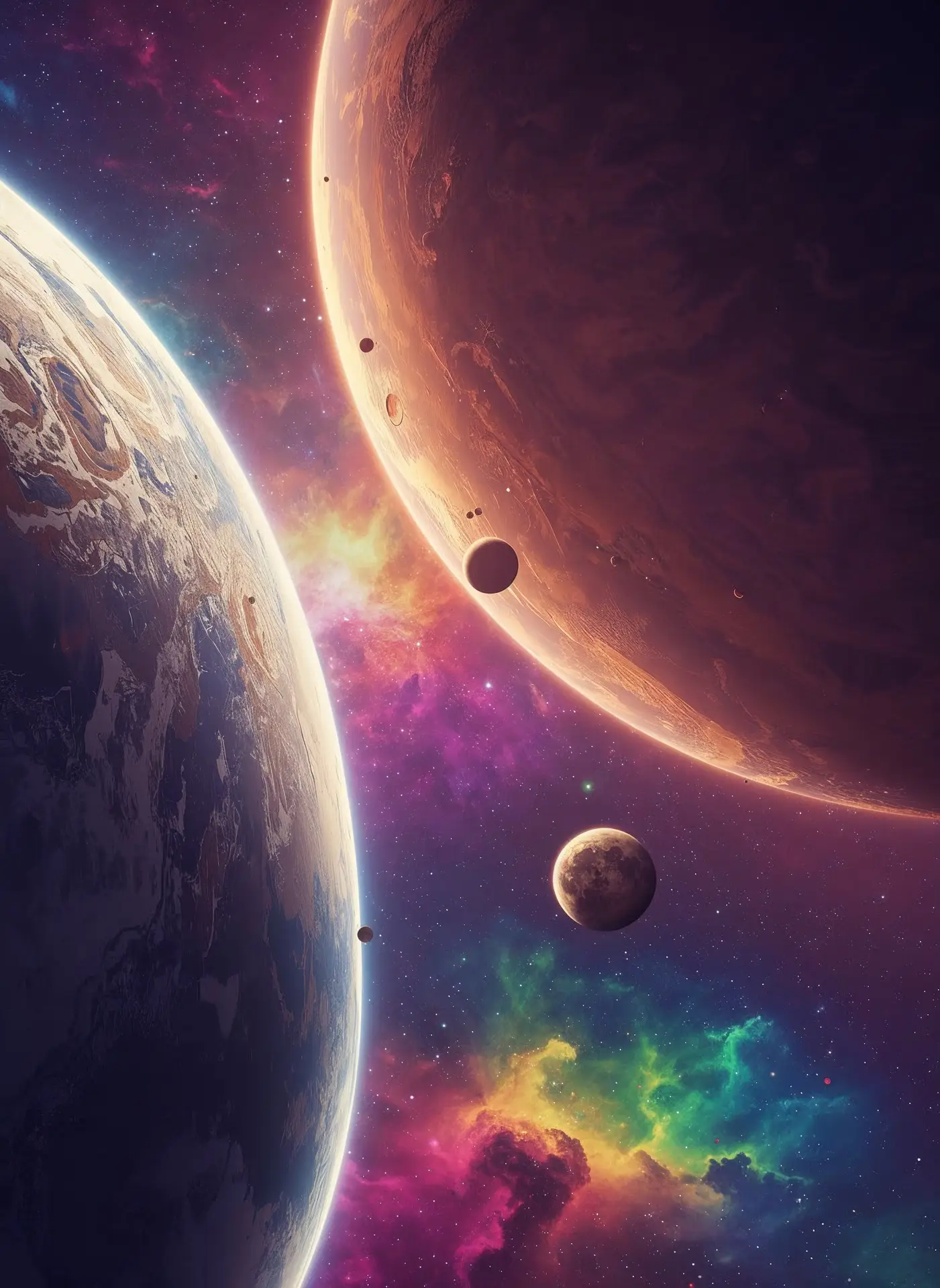 De warme gloed van de ene planeet contrasteert prachtig met de koelere tinten van de andere, terwijl levendige nevels in roze, groen en paars zorgen voor een dynamisch en bijna surrealistisch effect. De compositie creëert een sterk gevoel van schaal en diepte, alsof je getuige bent van een zeldzaam moment in het universum.