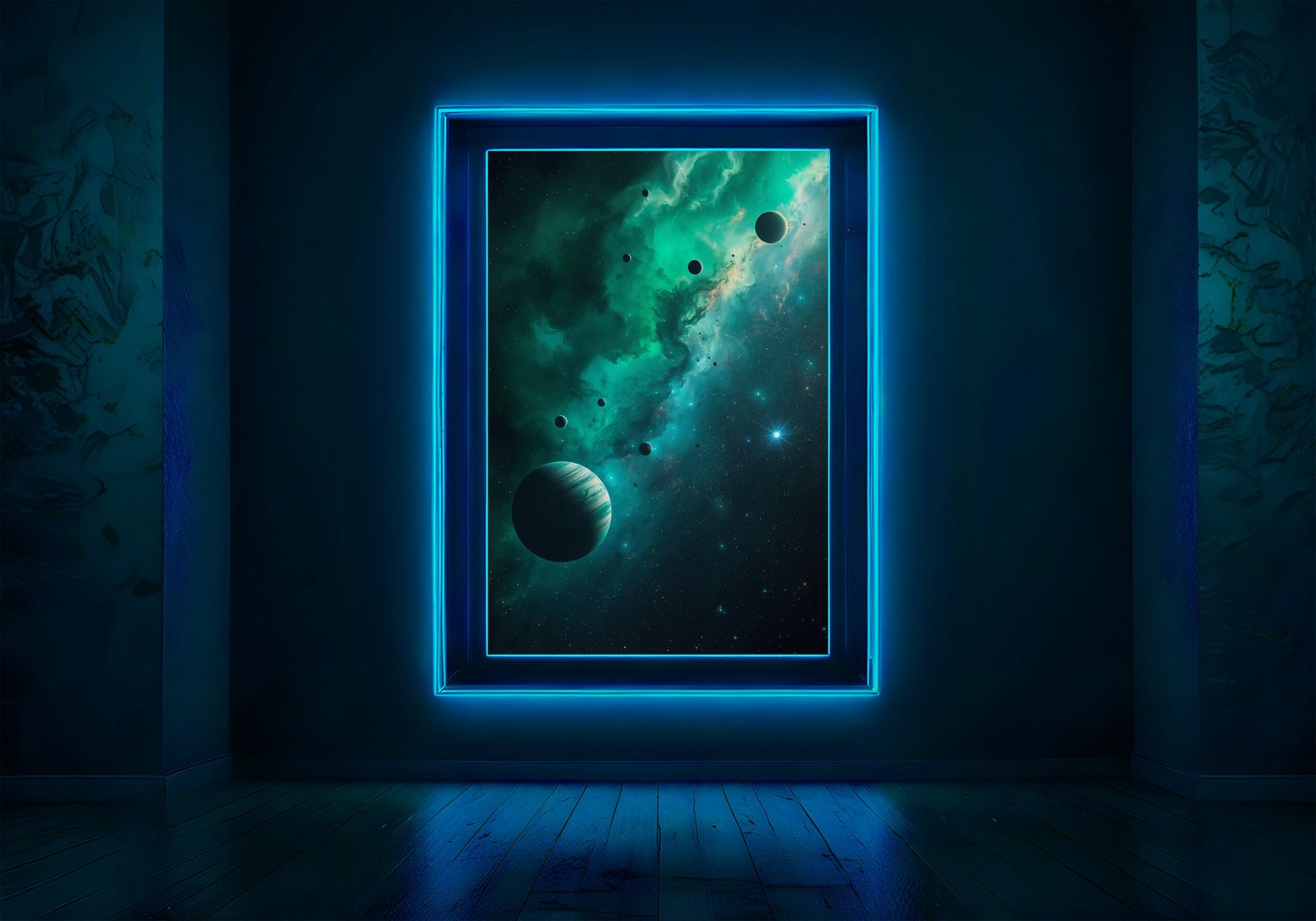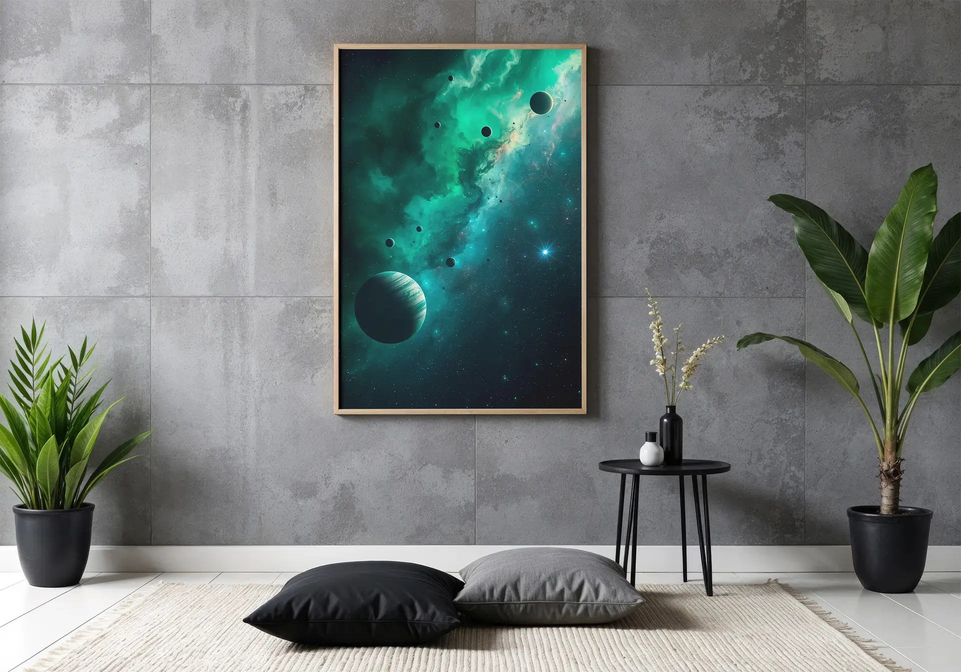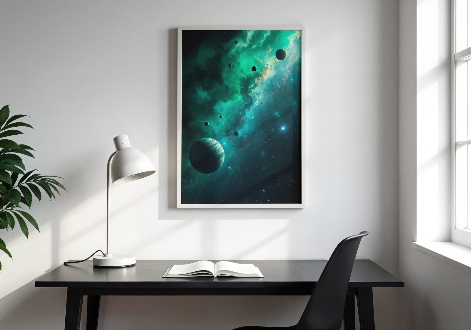Breng een rustgevende maar mysterieuze kosmische sfeer in je ruimte met deze indrukwekkende space poster. Een groene nevel strekt zich uit door het universum, omringd door zwevende planeten en een eindeloos sterrenveld dat diepte en stilte uitstraalt.