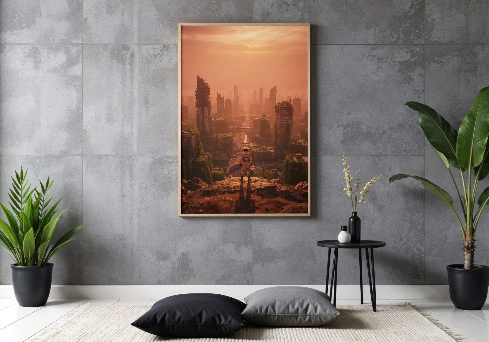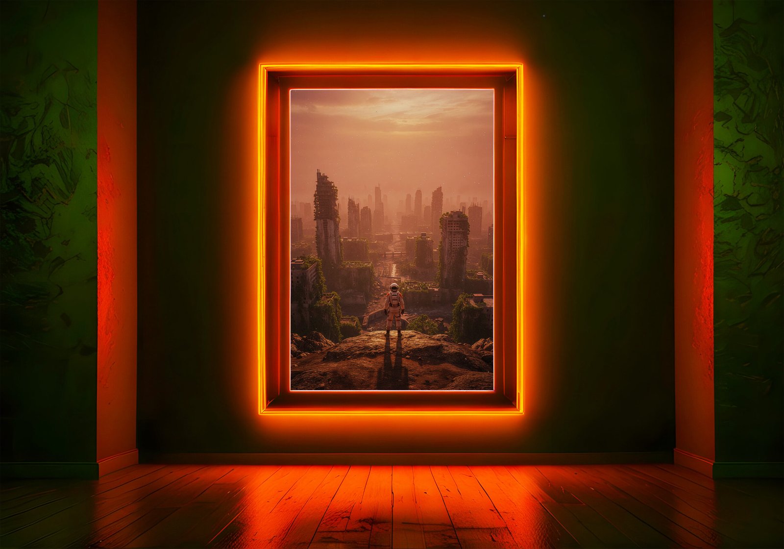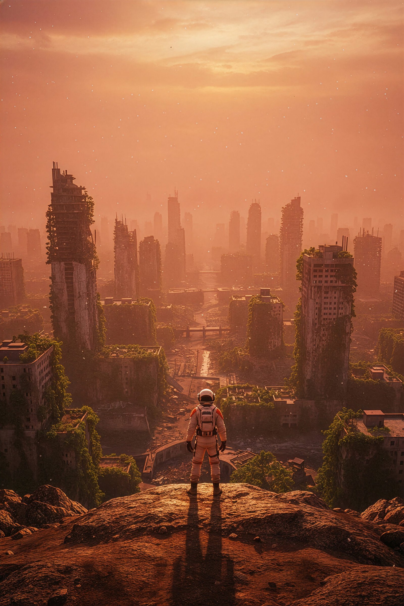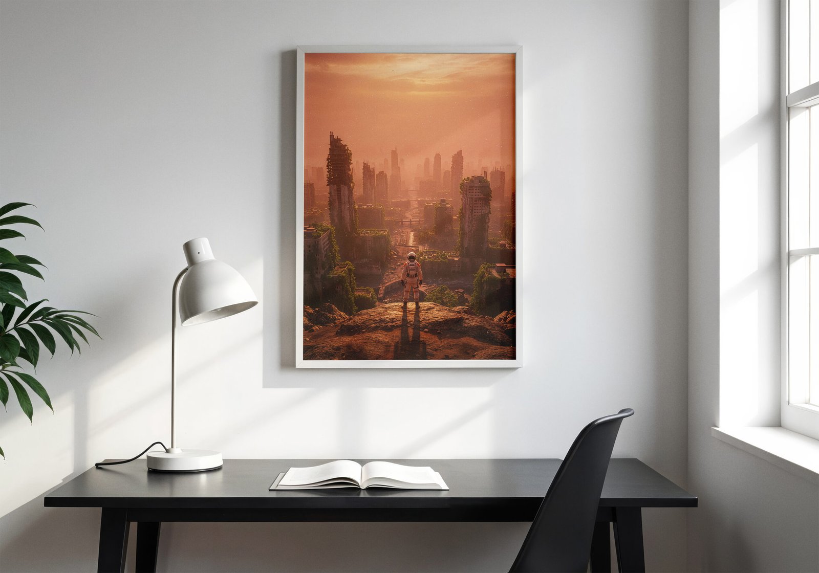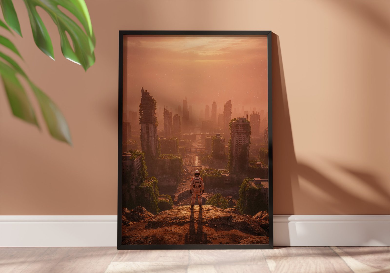 Een wereld waarin de natuur het heeft overgenomen. Deze poster toont de resten van een stad die langzaam wordt opgeslokt door groen en verval.