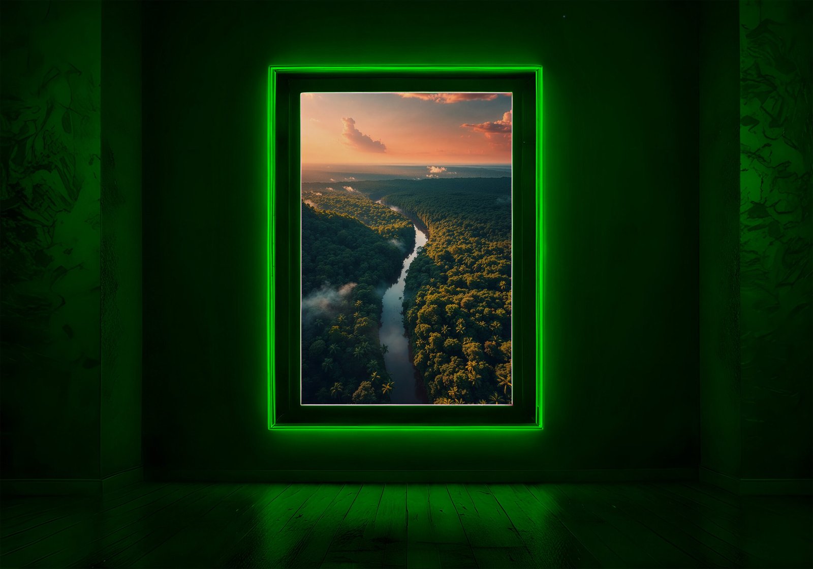 De combinatie van diep groen en warm licht geeft het beeld een levendige en energieke uitstraling. Het perspectief en de lichtval zorgen voor een dynamisch geheel dat direct de aandacht trekt.