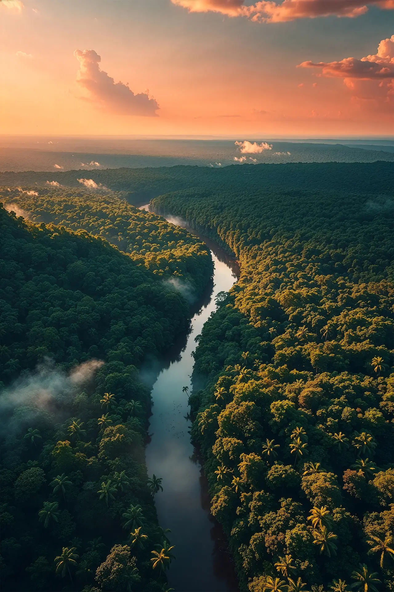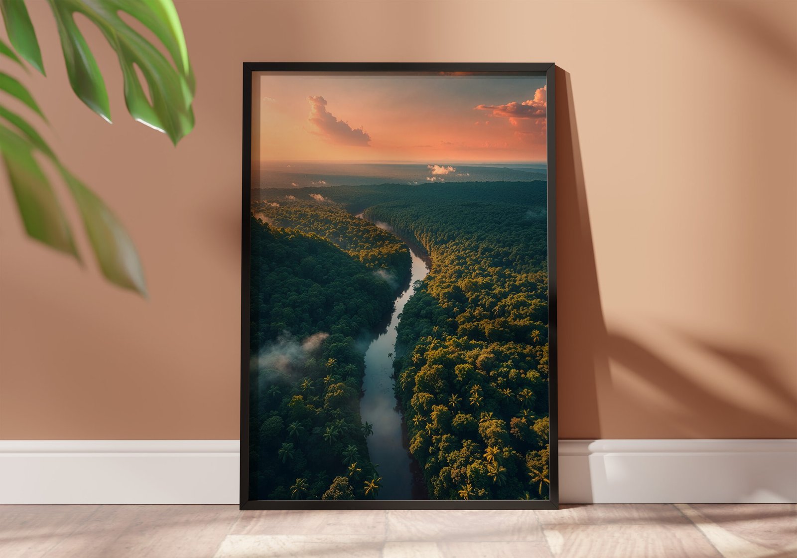 Breng een warme en avontuurlijke natuurbeleving in je ruimte met deze tropische jungle poster. Een rivier slingert door het landschap terwijl de zon het geheel in gouden tinten hult.