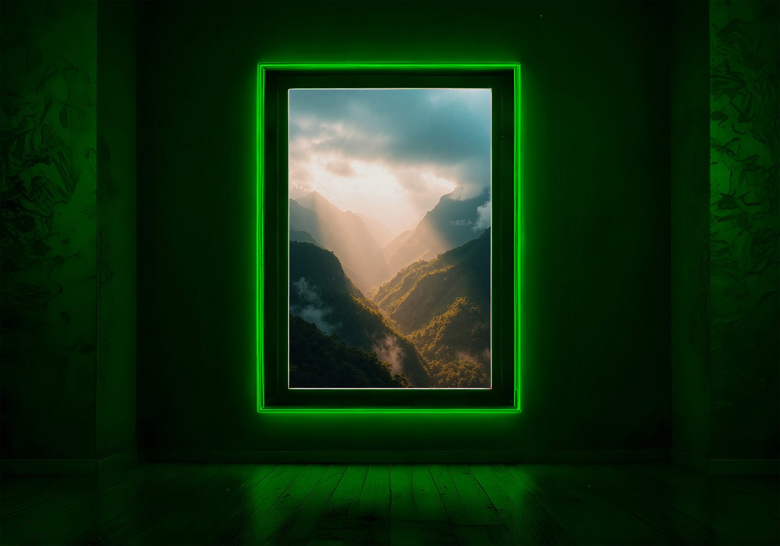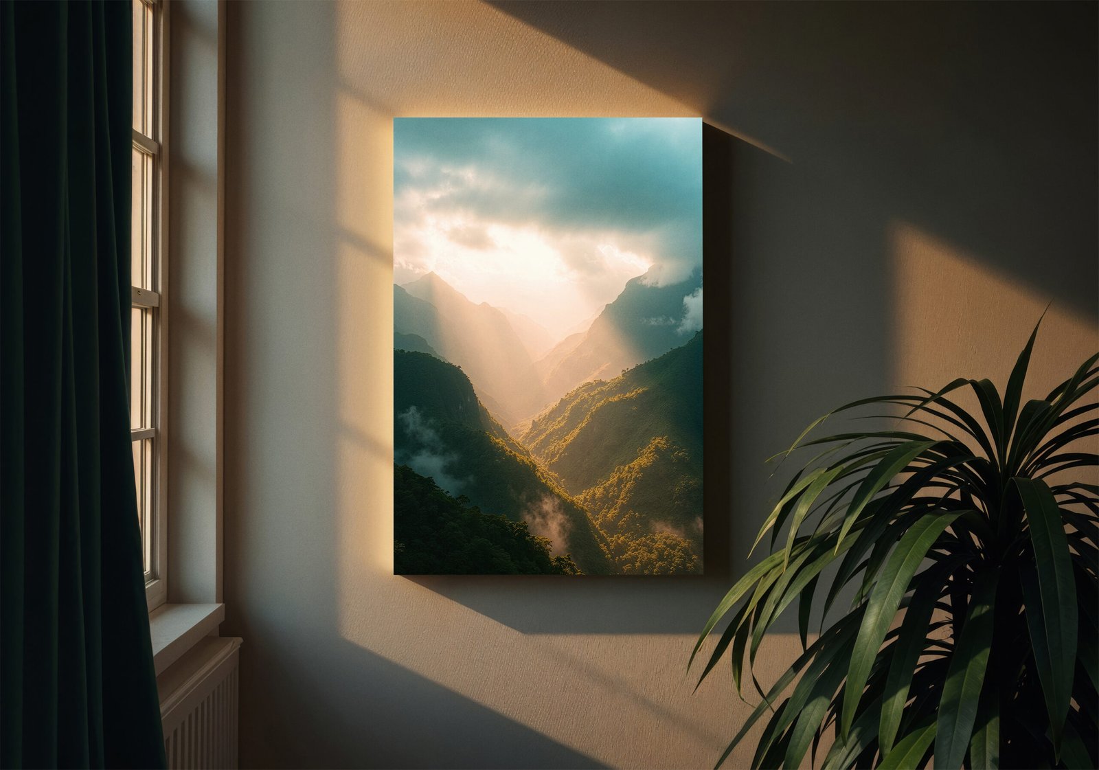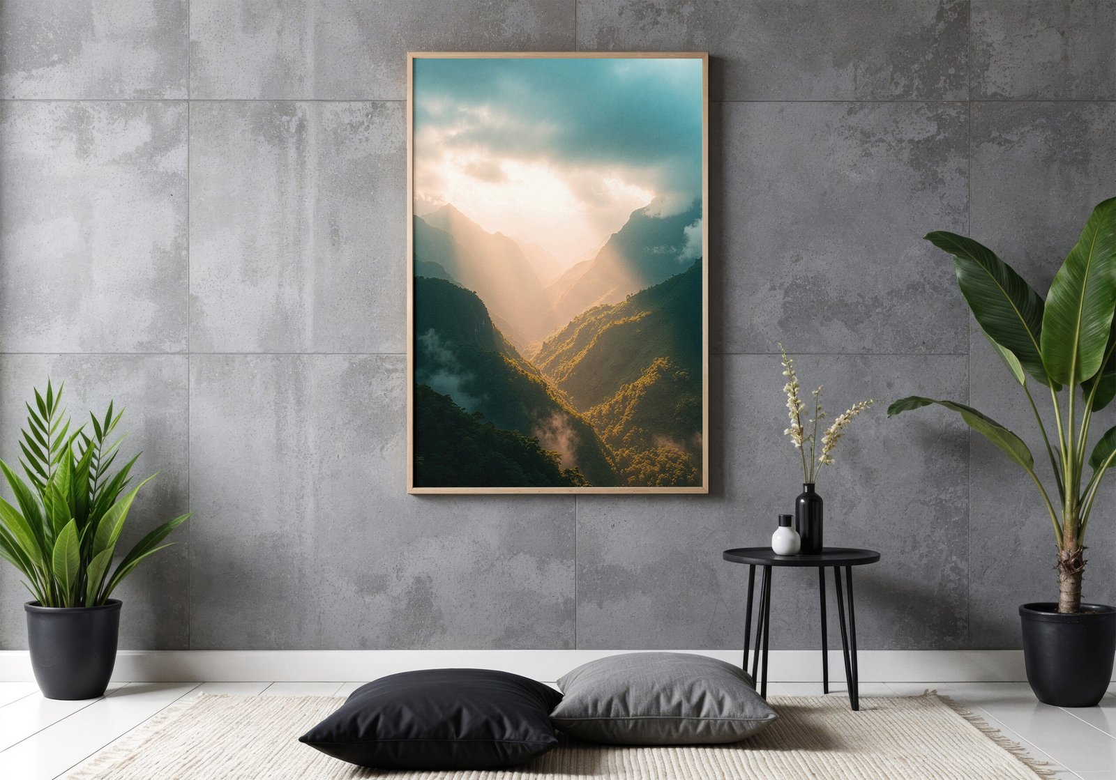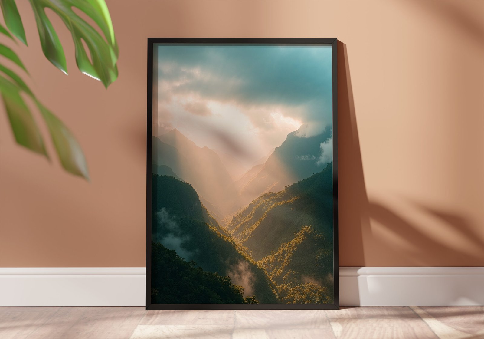 Gedrukt op hoogwaardig posterpapier voor een scherpe en levendige weergave van kleuren, waardoor elk detail tot leven komt — van de zachte mist tot de lichtstralen tussen de bergen.