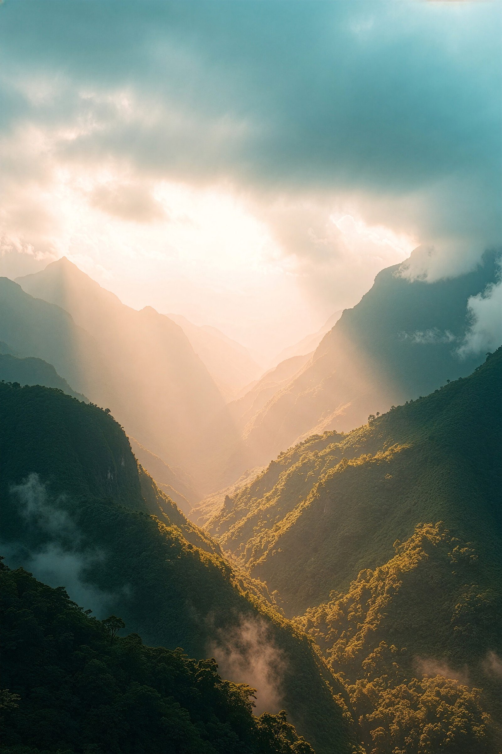 Breng een warme en rustgevende natuurbeleving in je ruimte met deze indrukwekkende bergposter. Zonnestralen breken door een dik wolkendek en verlichten de diepe valleien, waardoor een magisch spel van licht en schaduw ontstaat.