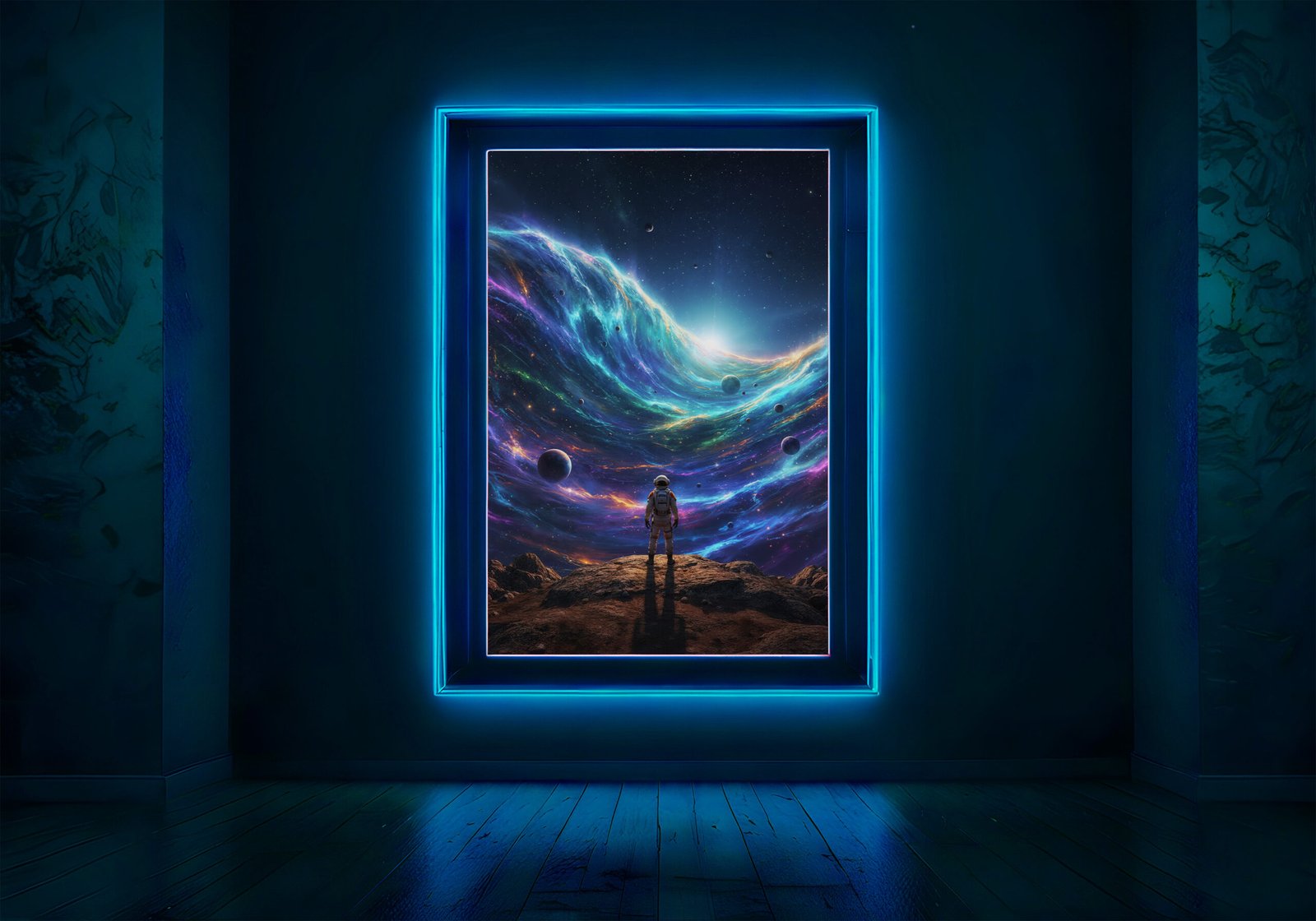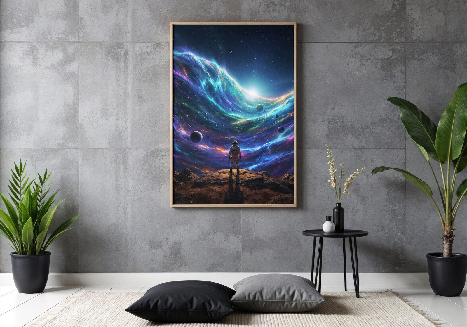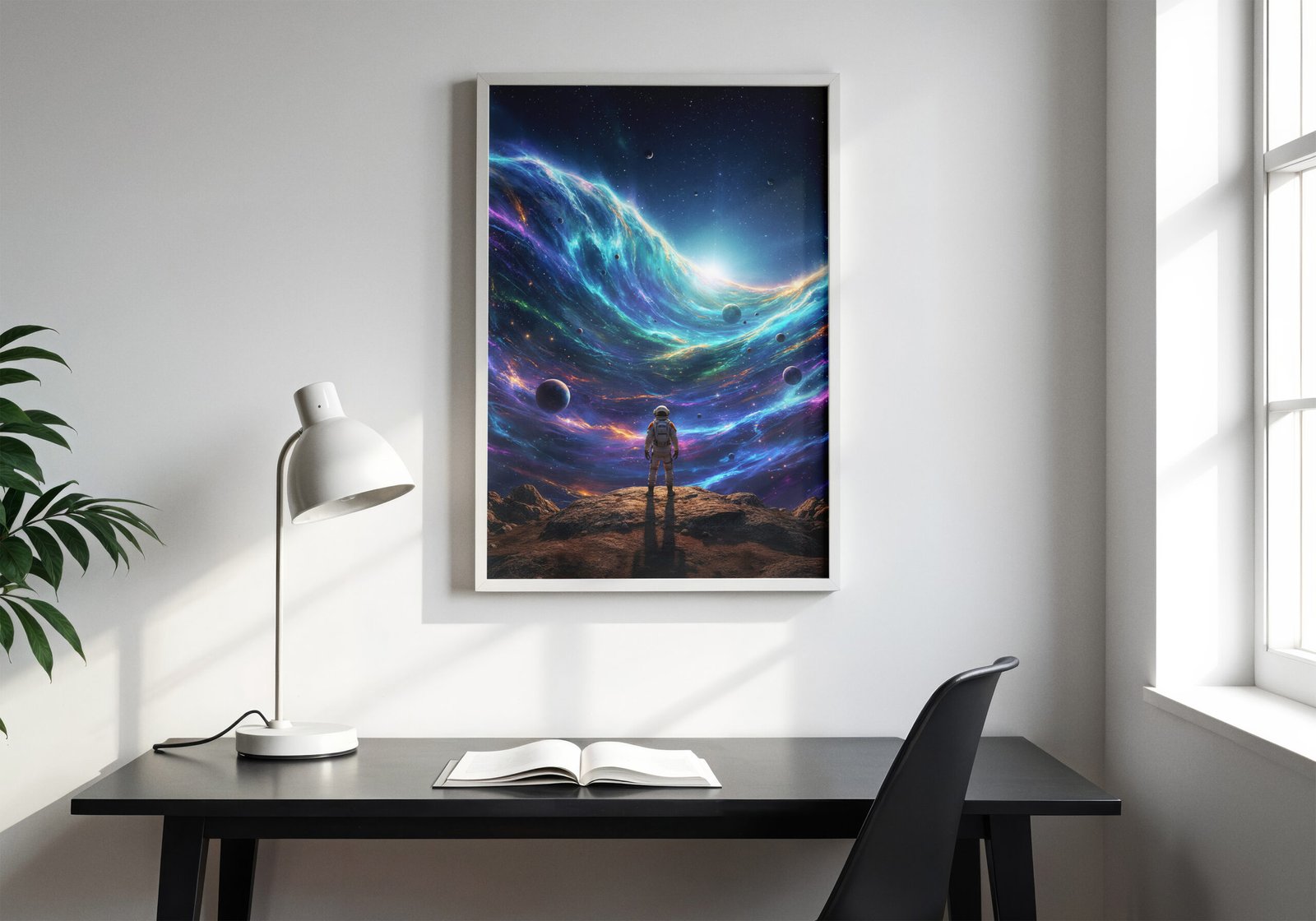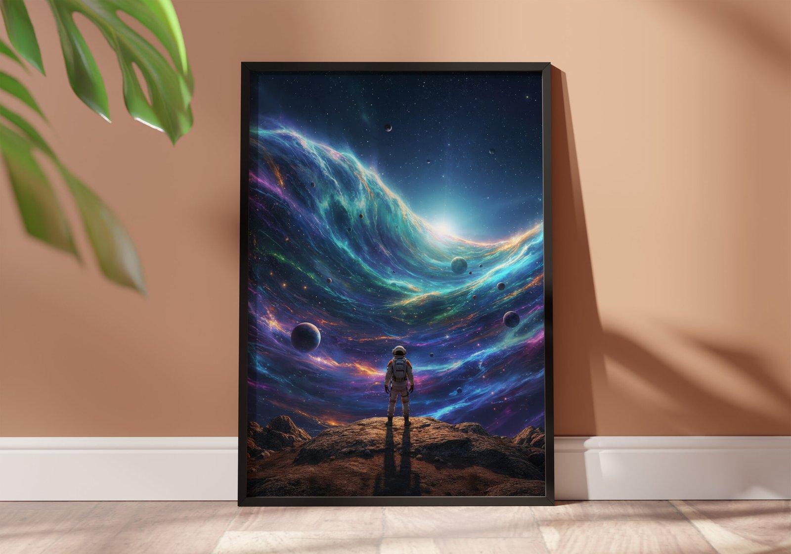 Een visueel spektakel waarin planeten, sterren en energie samenkomen in een draaiende kosmische spiraal. Deze poster symboliseert het idee van meerdere universums en oneindige mogelijkheden.