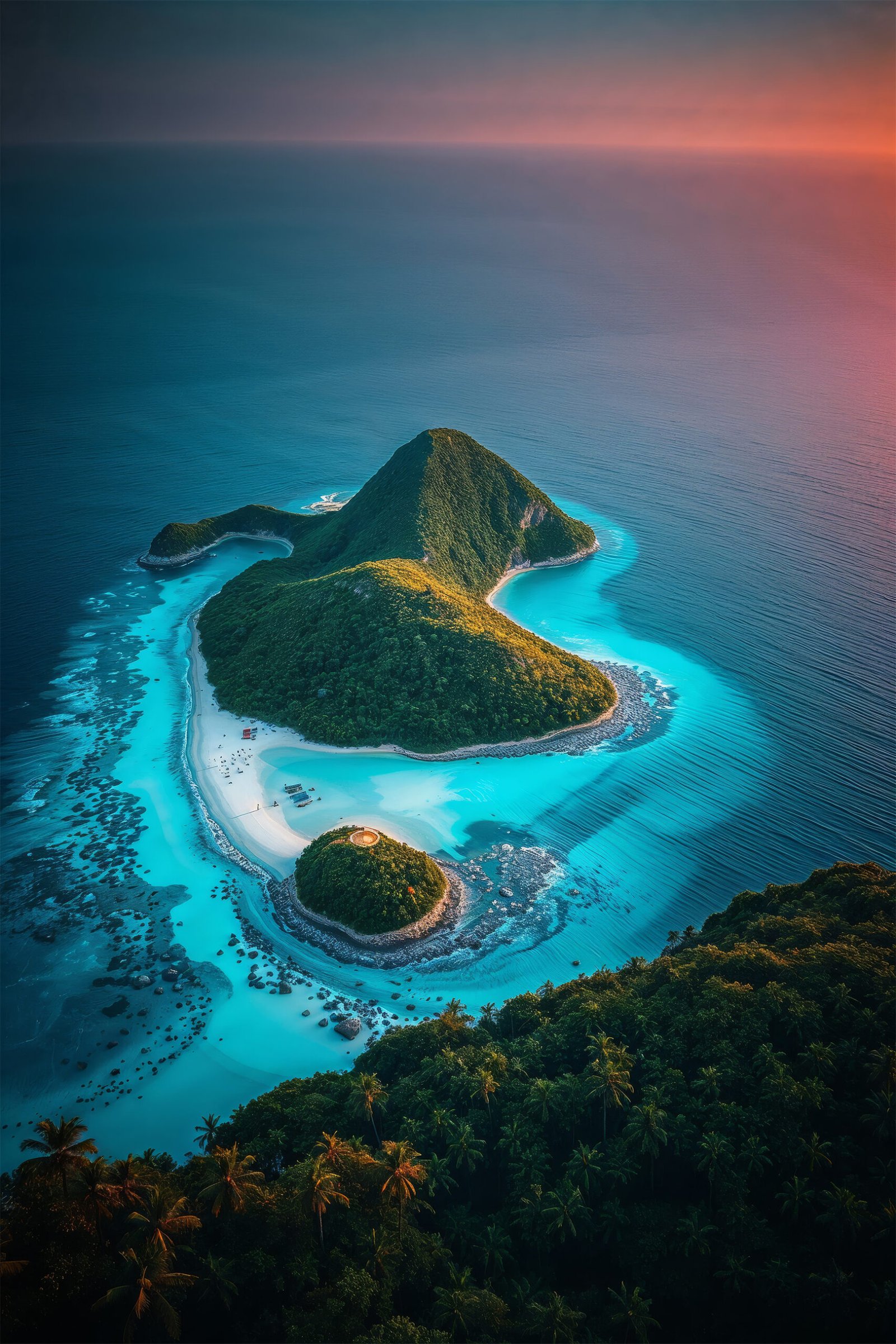 De combinatie van zachte stranden, helder water en groene natuur geeft het beeld een ontspannen en luxe uitstraling. Het luchtperspectief zorgt voor een ruimtelijk effect dat rust en vrijheid uitstraalt.