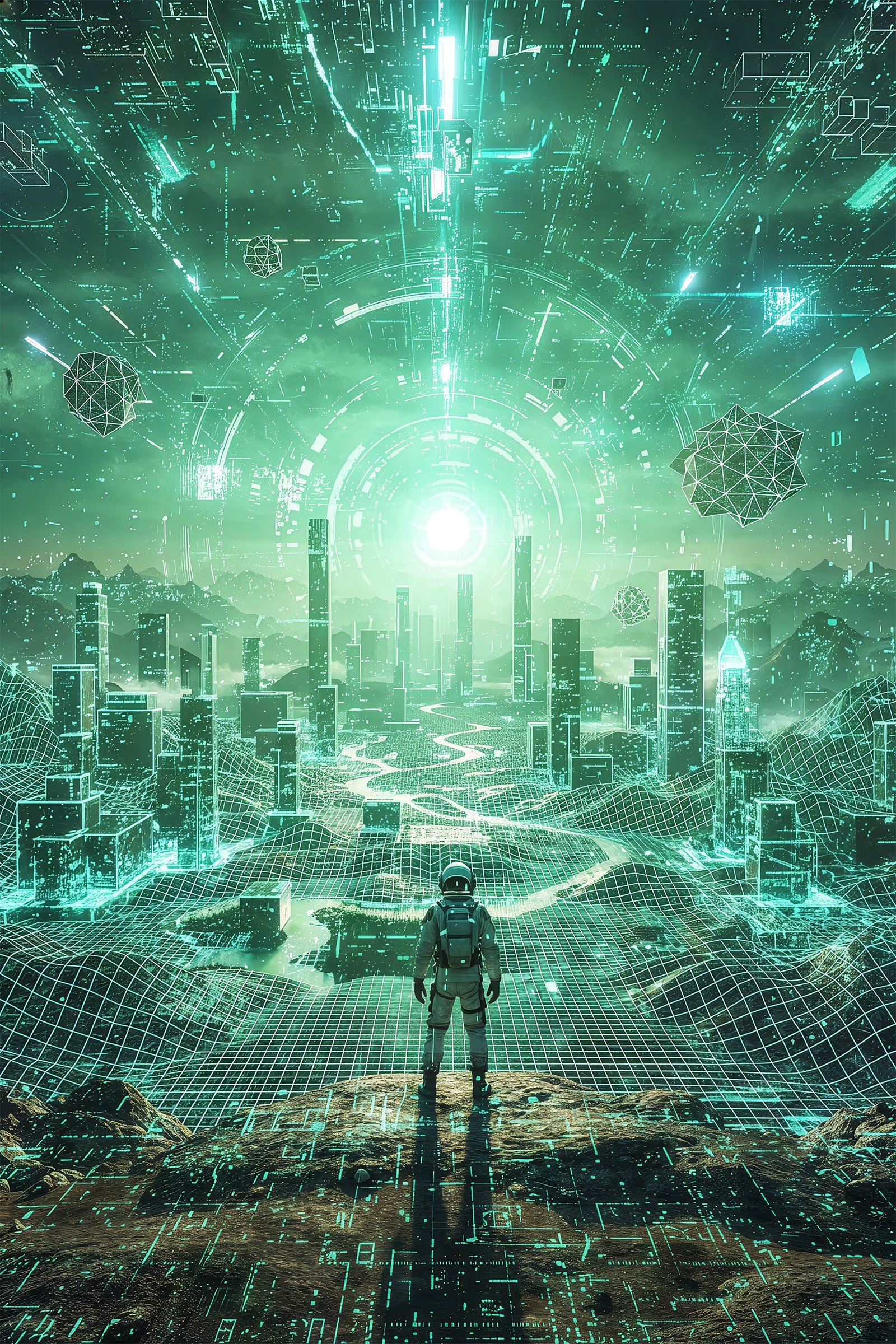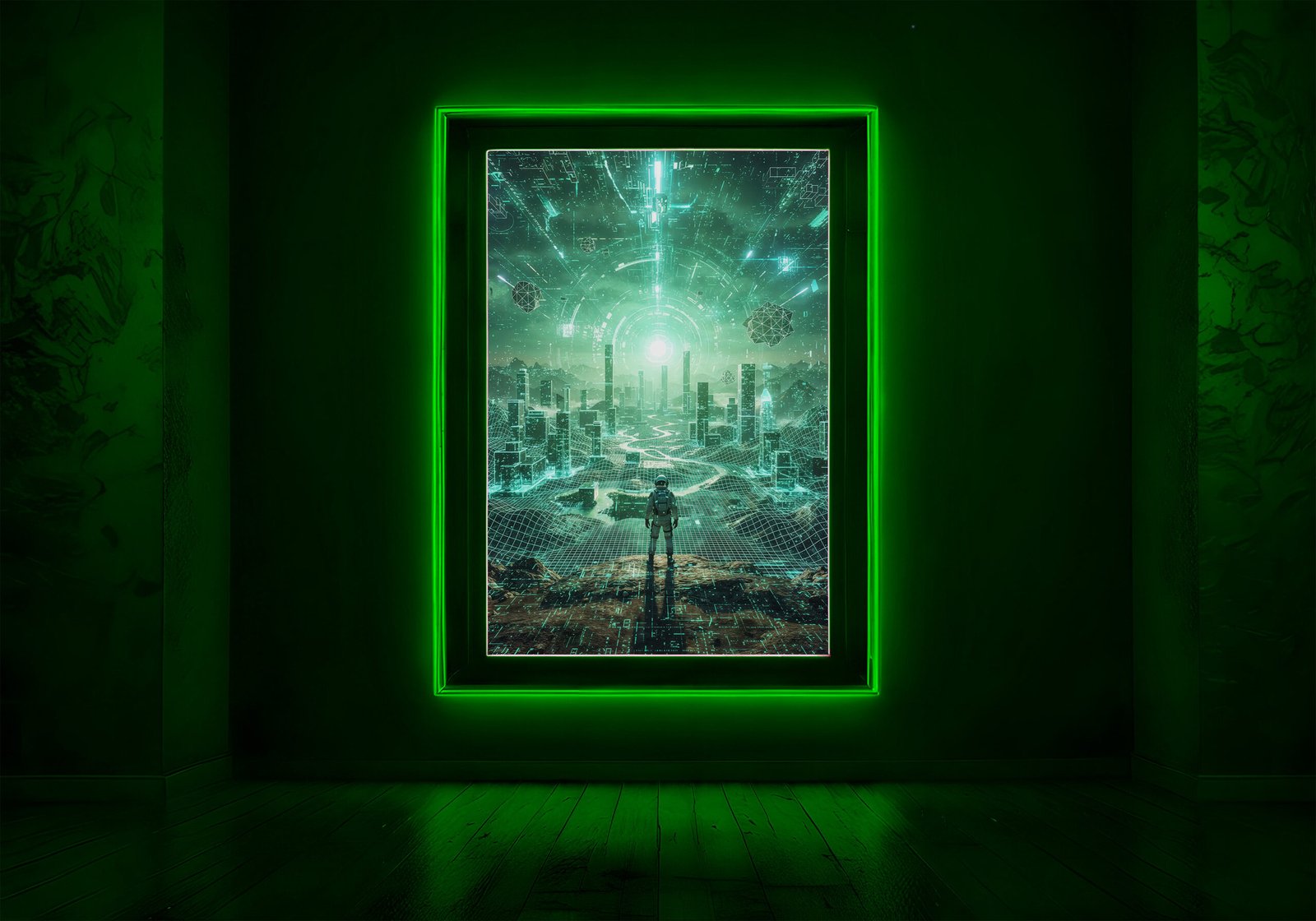 De groene neonachtige gloed en geometrische vormen creëren een krachtige cyberpunk sfeer. De astronaut kijkt uit over een wereld die volledig door technologie wordt gestuurd — mysterieus, modern en intens.
