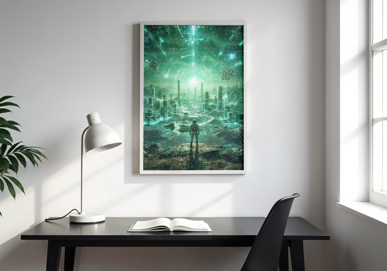 Stap in een digitale dimensie waar realiteit en technologie samensmelten. Deze poster toont een futuristische stad opgebouwd uit data, lijnen en holografische structuren, alsof je in een de Matrix bent beland.