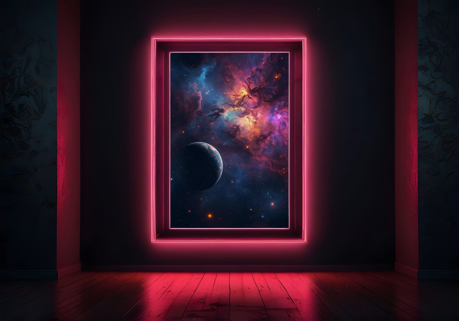 Breng een mysterieus en kleurrijk universum tot leven in je ruimte met deze indrukwekkende space poster. Een diepe, donkere planeet zweeft op de voorgrond, terwijl een explosieve nevel van licht en energie zich uitstrekt in de achtergrond.