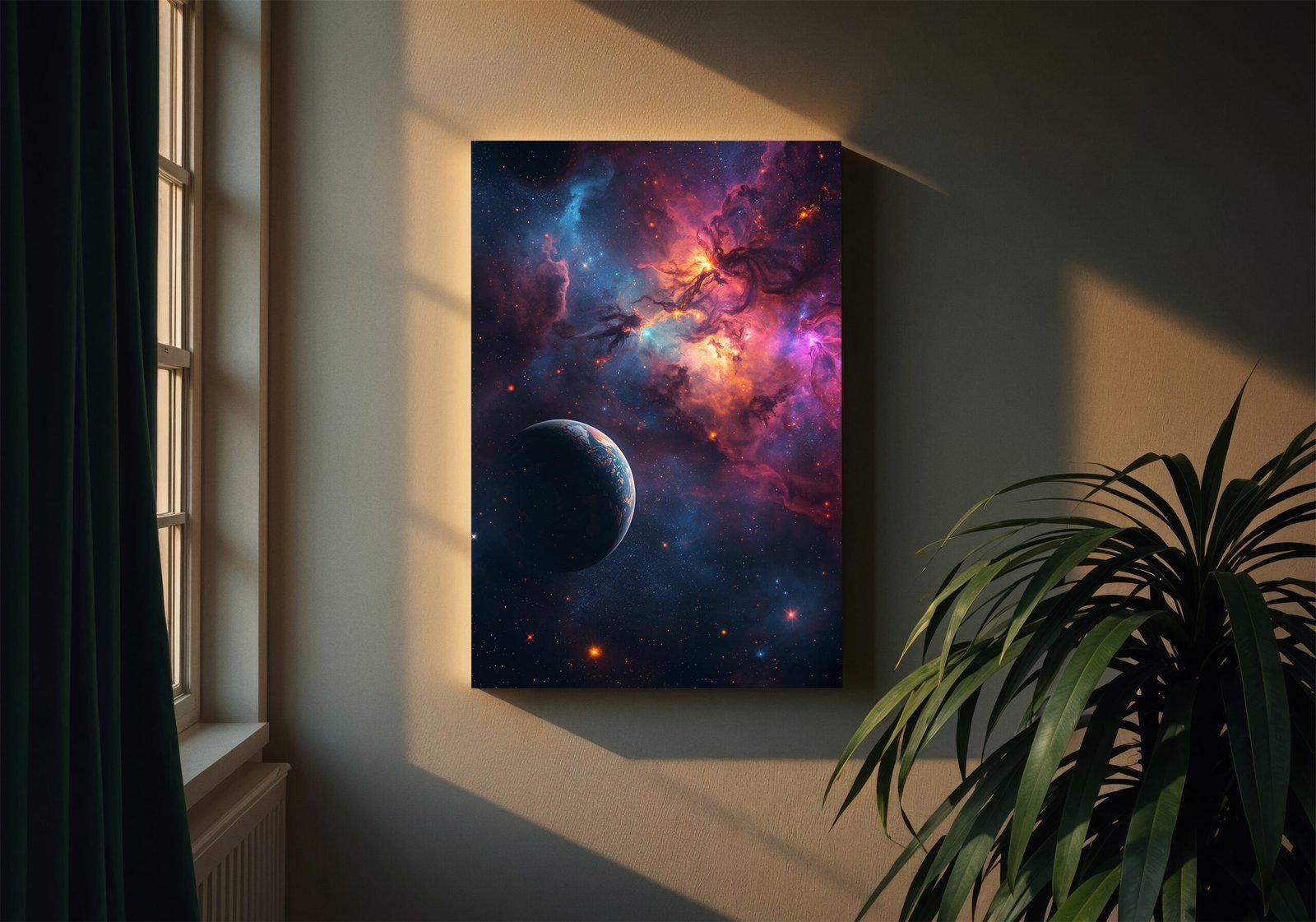De combinatie van warme oranje en paarse tinten met koele blauwe accenten zorgt voor een krachtig contrast en een levendig geheel. Subtiele details in de kosmische wolken en sterrenvelden geven het beeld een gevoel van beweging en oneindige diepte.