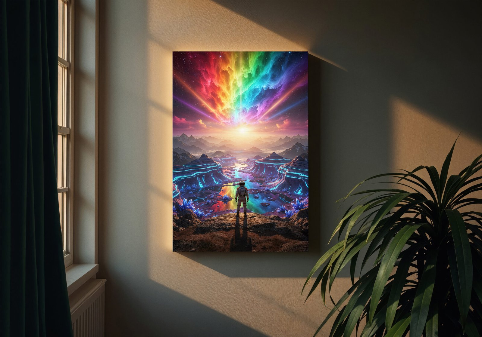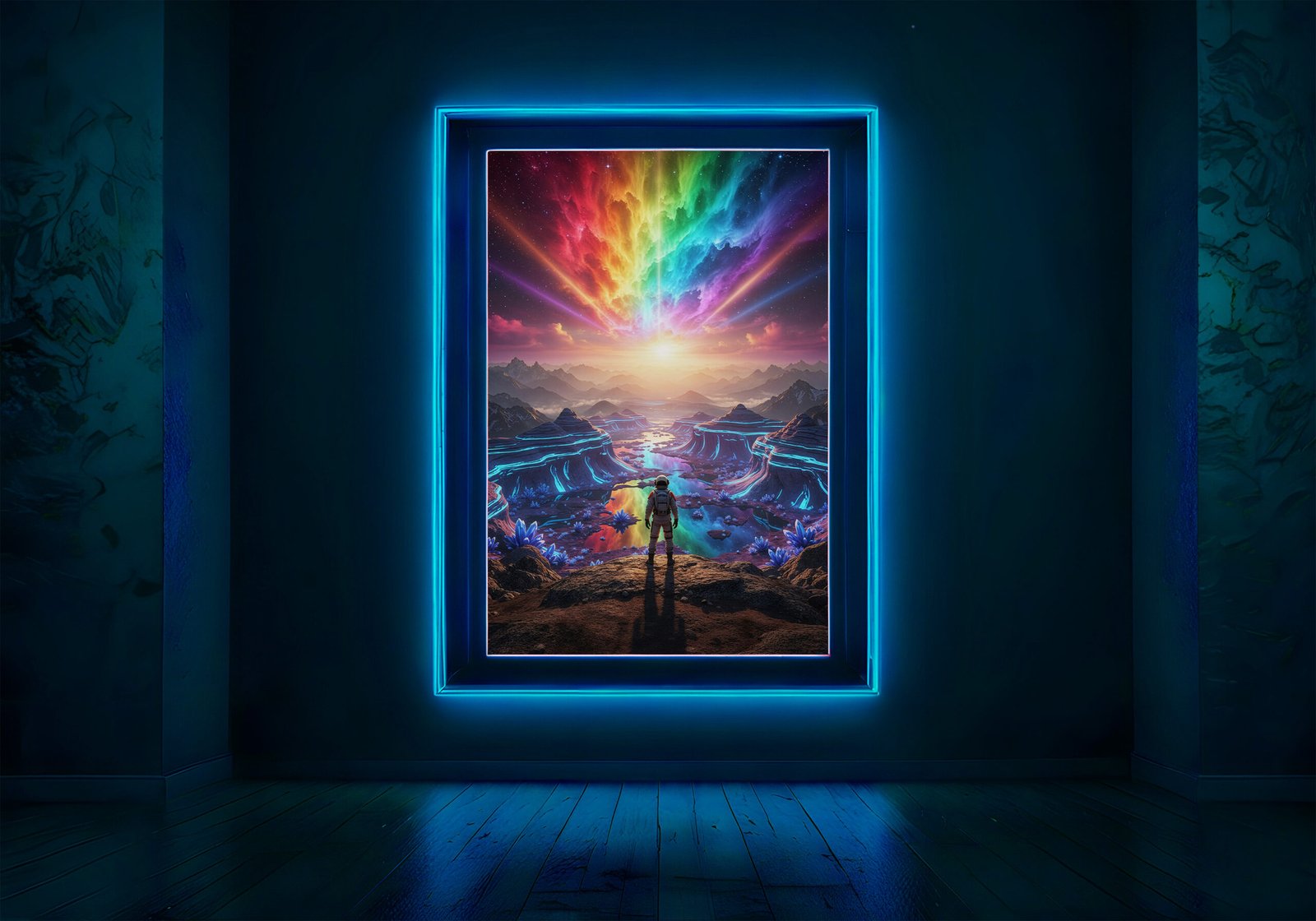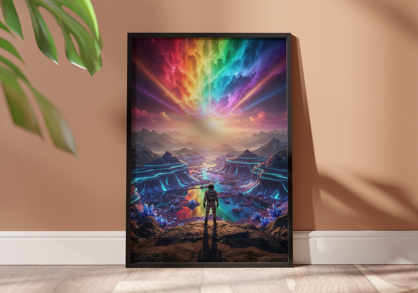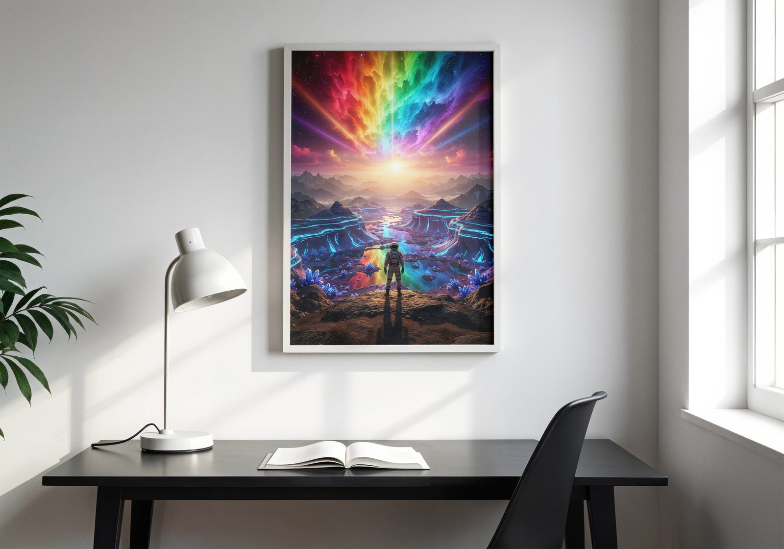 Een buitenaardse wereld waarin natuur en kleur samensmelten tot een droomachtig landschap. Deze poster toont gloeiende rivieren, surrealistische rotsformaties en een hemel die explodeert in kleur.
