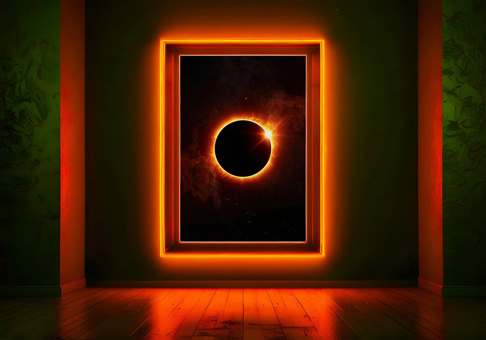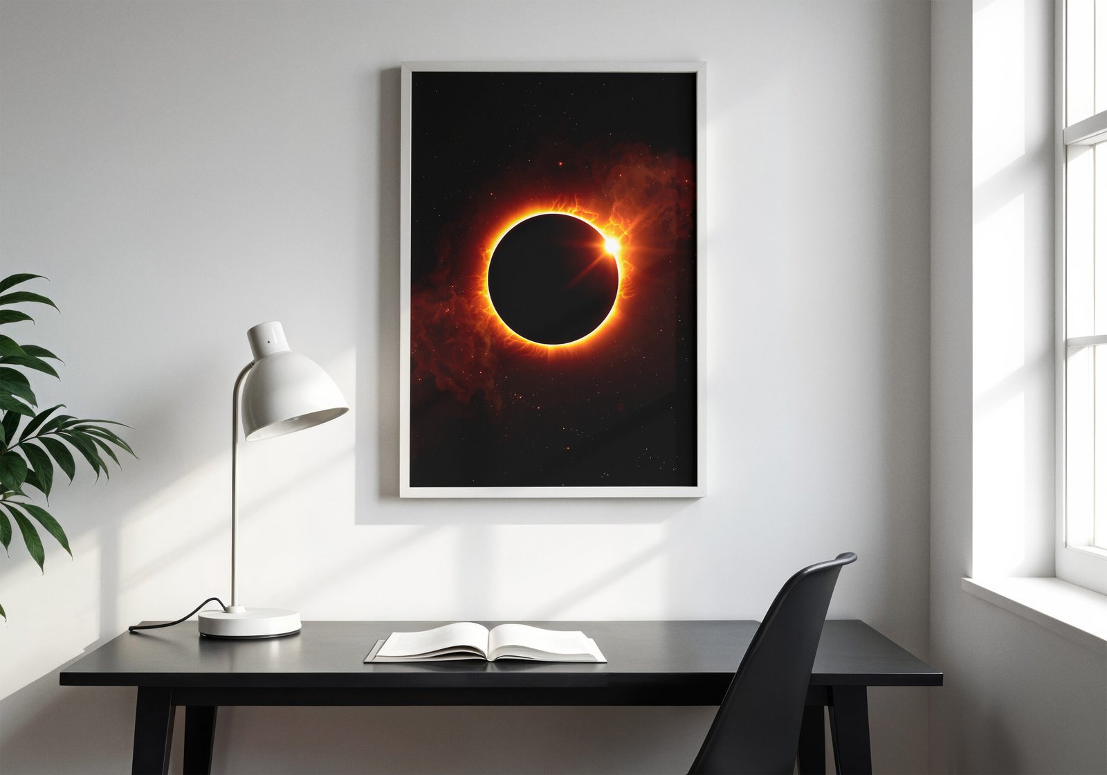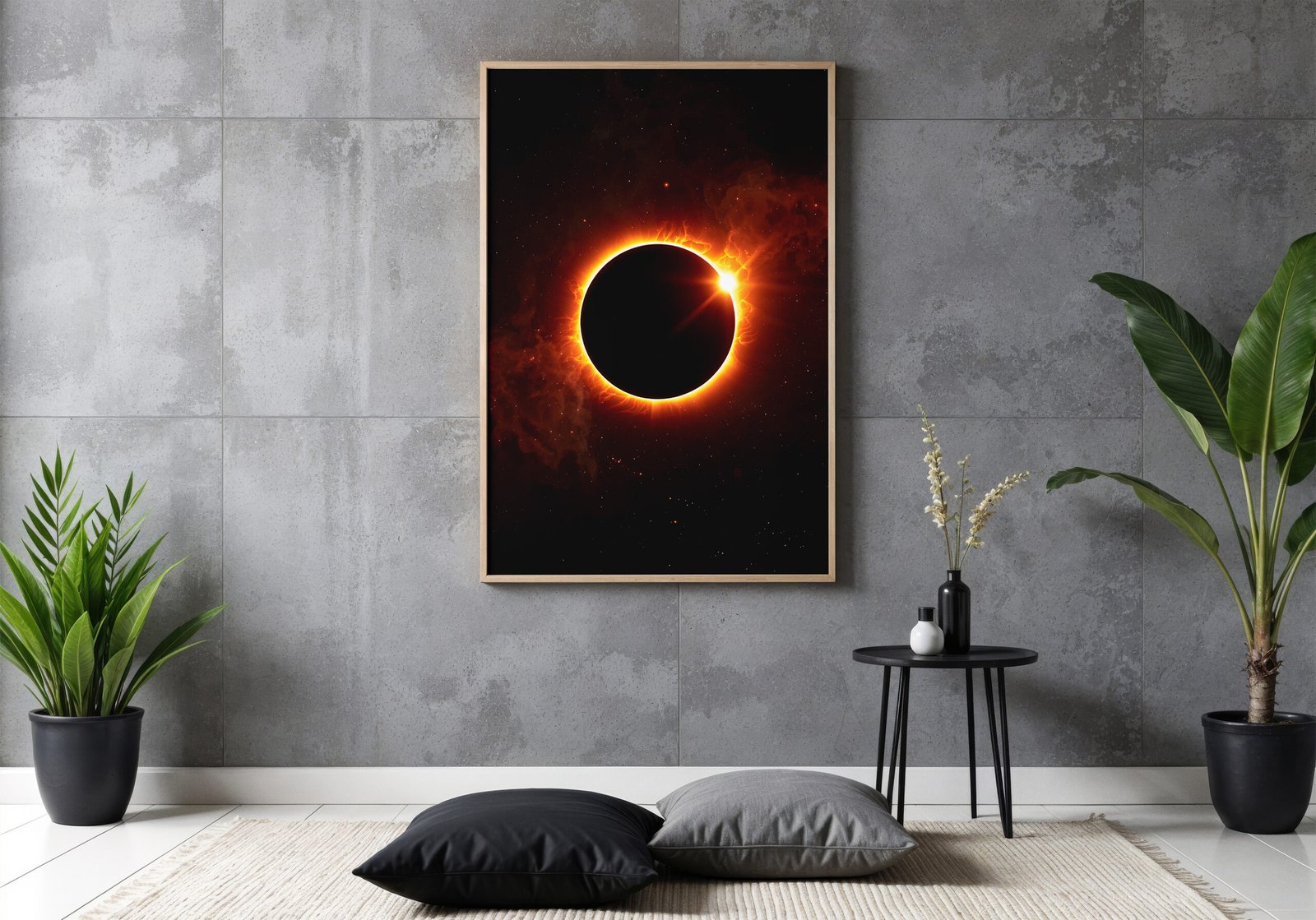 Breng een intense en indrukwekkende ruimtebeleving in je ruimte met deze krachtige eclipse poster. Een zonsverduistering vormt een perfecte donkere cirkel omringd door een vurige lichtkrans.