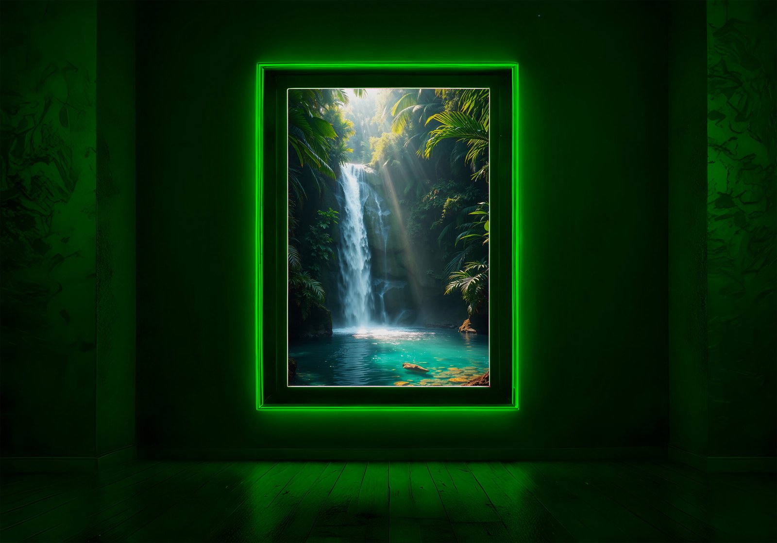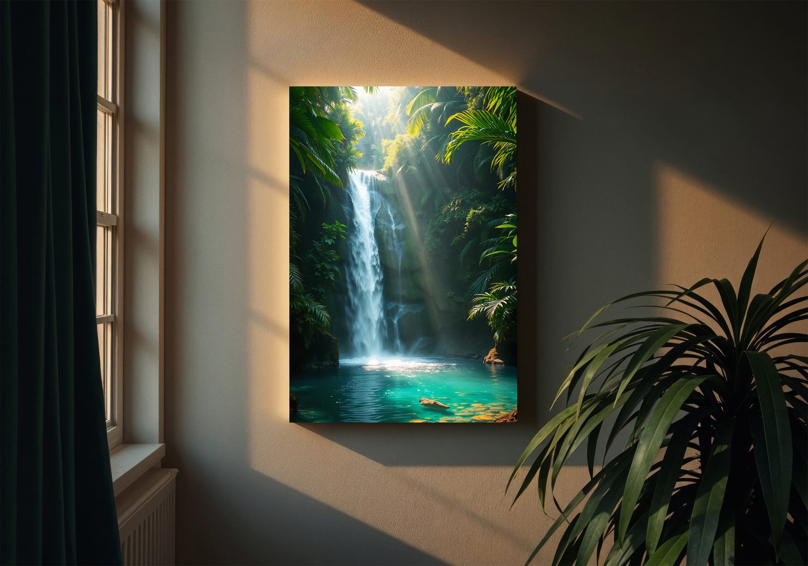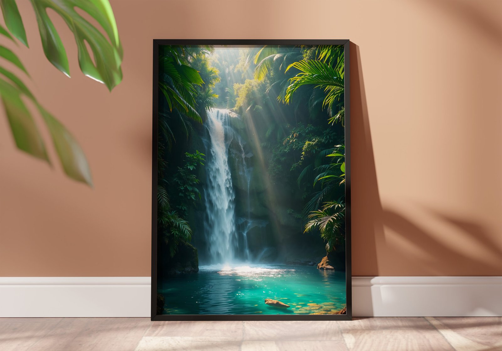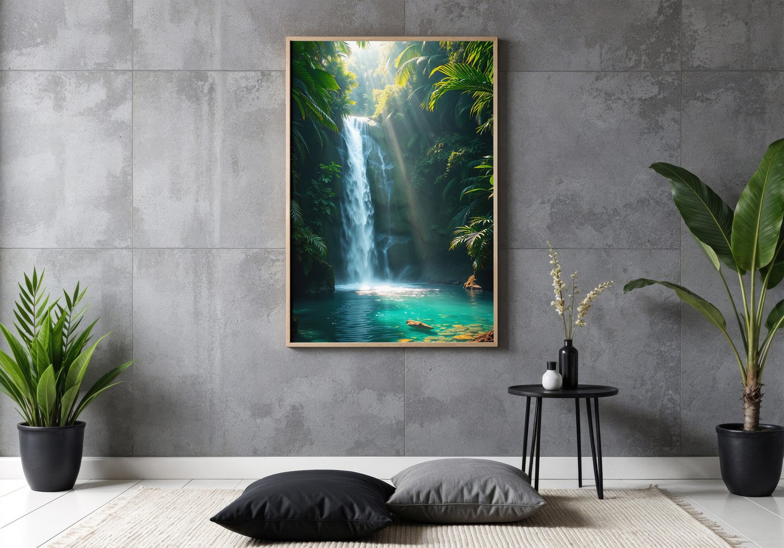 Gedrukt op hoogwaardig posterpapier voor een scherpe en levendige weergave van kleuren, waardoor elk detail tot leven komt — van de waterdruppels tot de bladeren rondom de waterval.