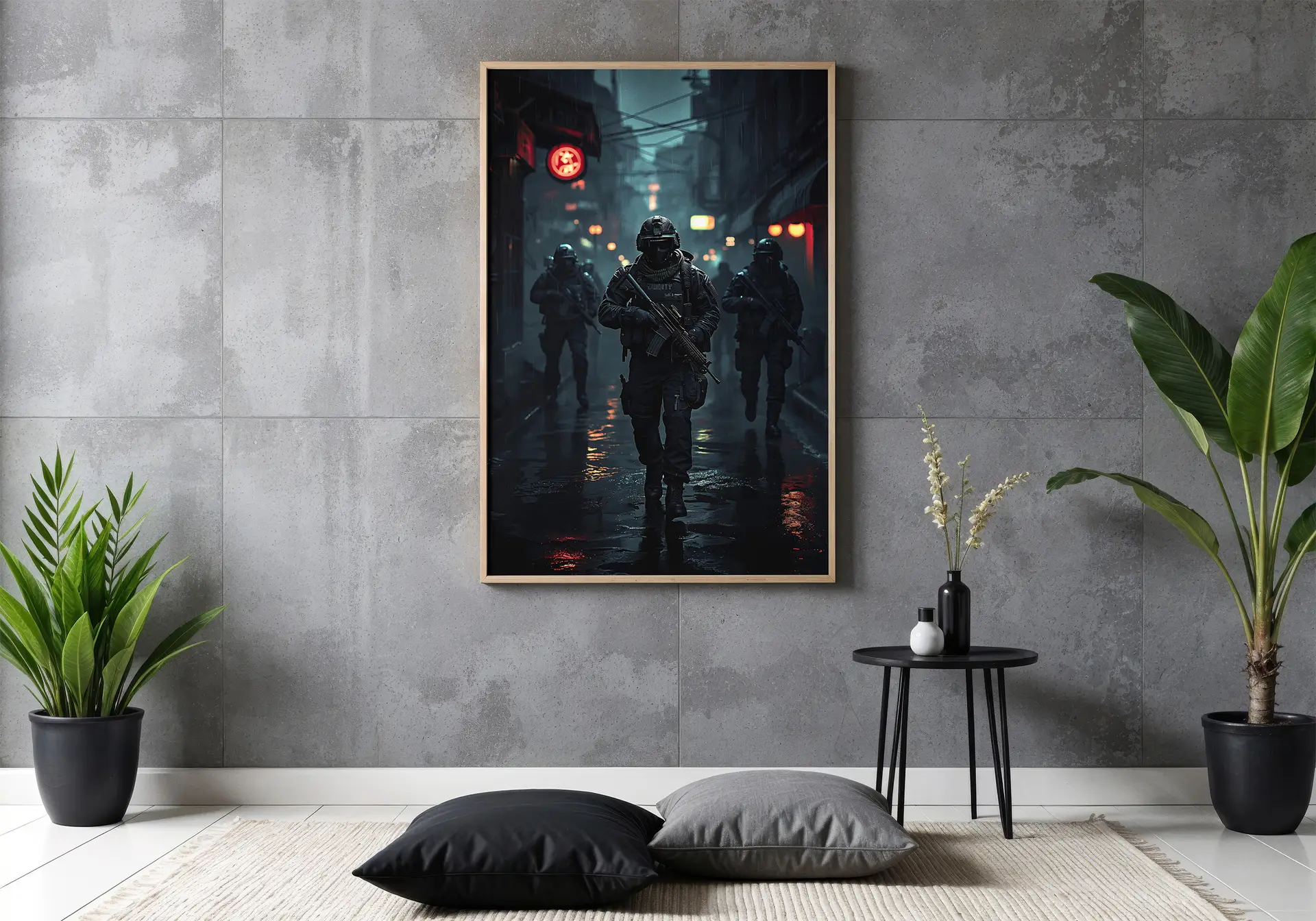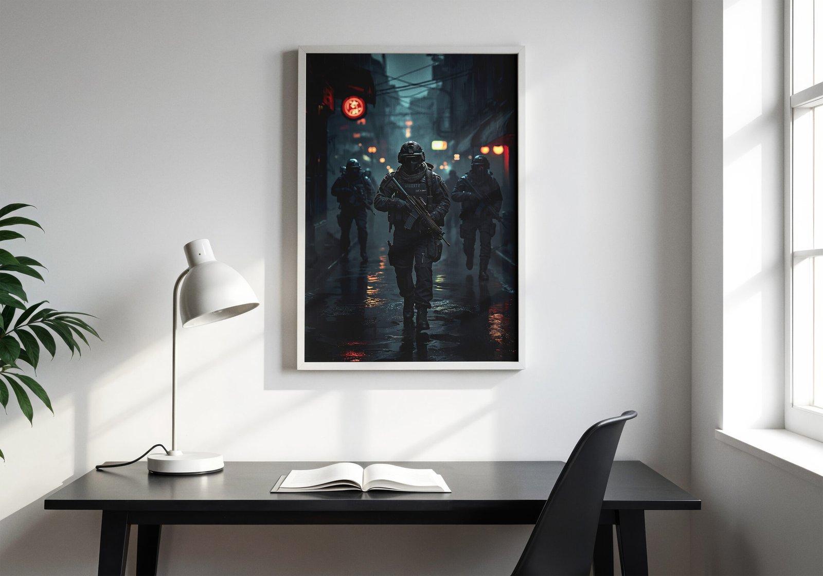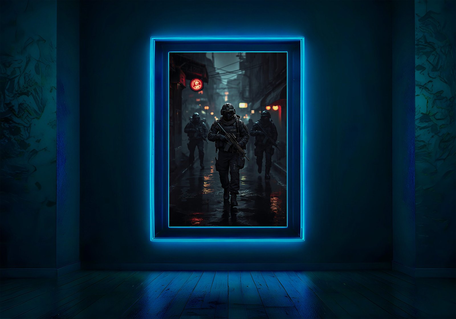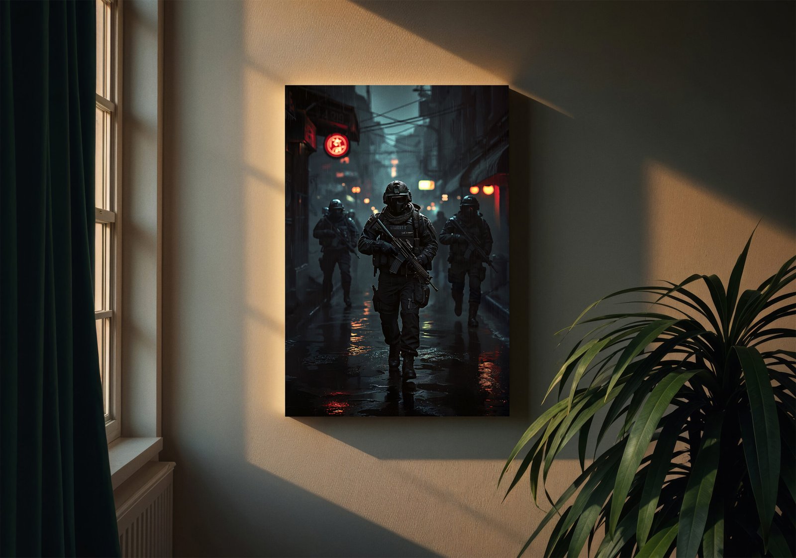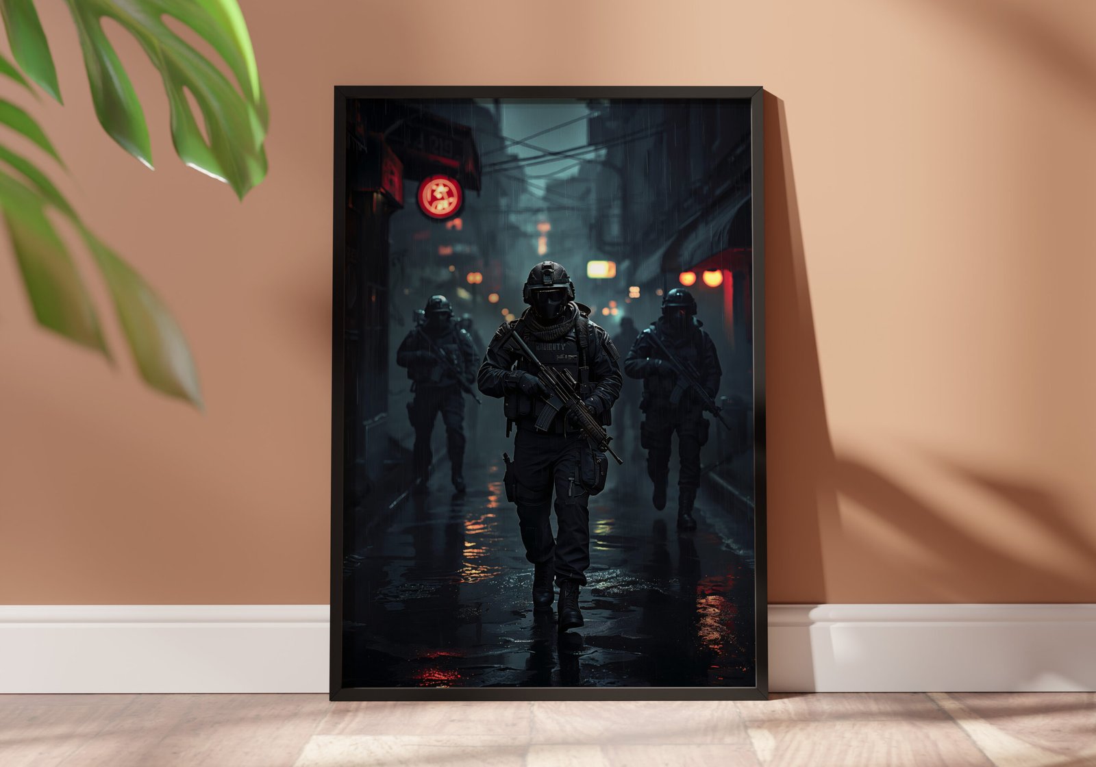 Breng de intense sfeer van een tactische missie in je ruimte met deze krachtige gaming poster. Een team van gewapende operators beweegt door een donkere, regenachtige stad, terwijl neonlichten en reflecties het beeld een rauwe en cinematografische uitstraling geven.