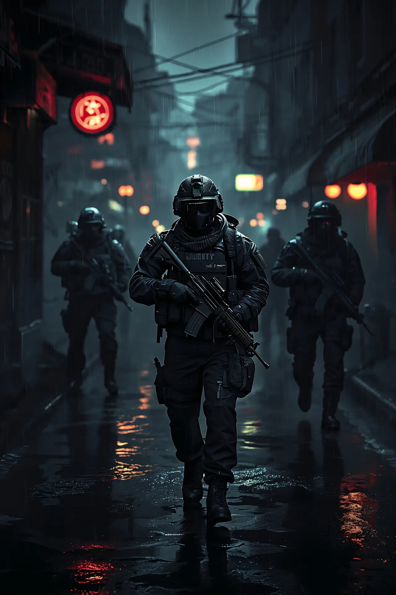 De combinatie van diepe schaduwen en subtiele lichtaccenten zorgt voor een spannend en dynamisch geheel. De natte straten en mistige omgeving versterken het gevoel van actie en realisme, alsof je midden in een high-stakes missie zit.